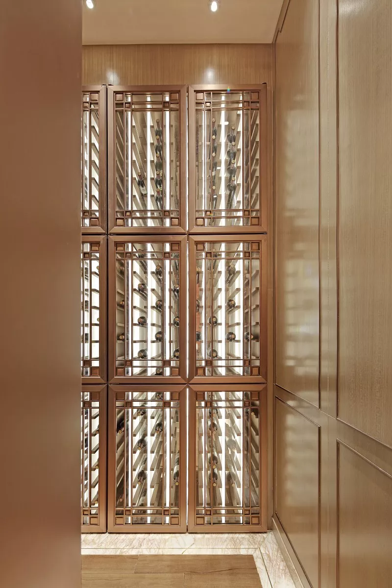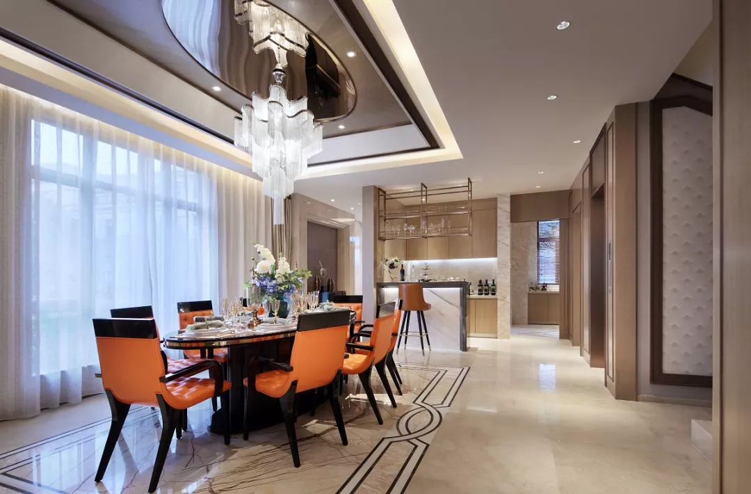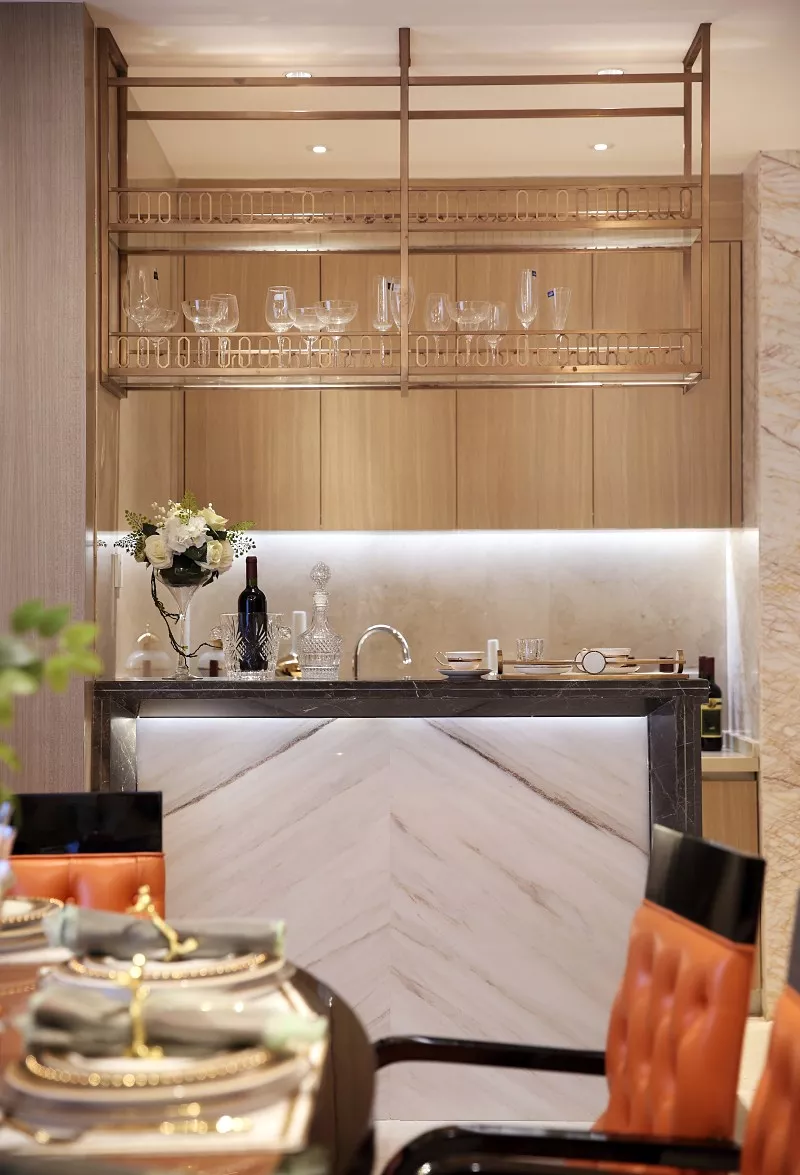 浅色大理石,跳跃橙色餐椅,搭配铁艺酒架的金属感,给空间带来视觉上的层次感,用色彩活跃气氛,让用餐变成一件愉快却又优雅的事。