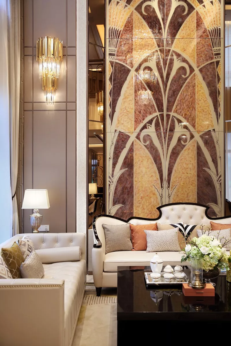 精简的线条,饱含奢华感,通过异材质的搭配,石材和金属材料恰到好处的结合,让客厅变得奢华美好,创造出一种更具浪漫、动感而又华丽纤细的装饰格局。米色系作为沙发主调与地毯图案颜色相互融合,点缀了空间又不显突兀。