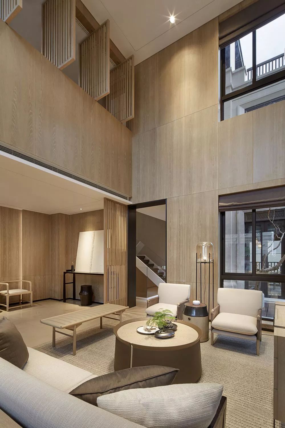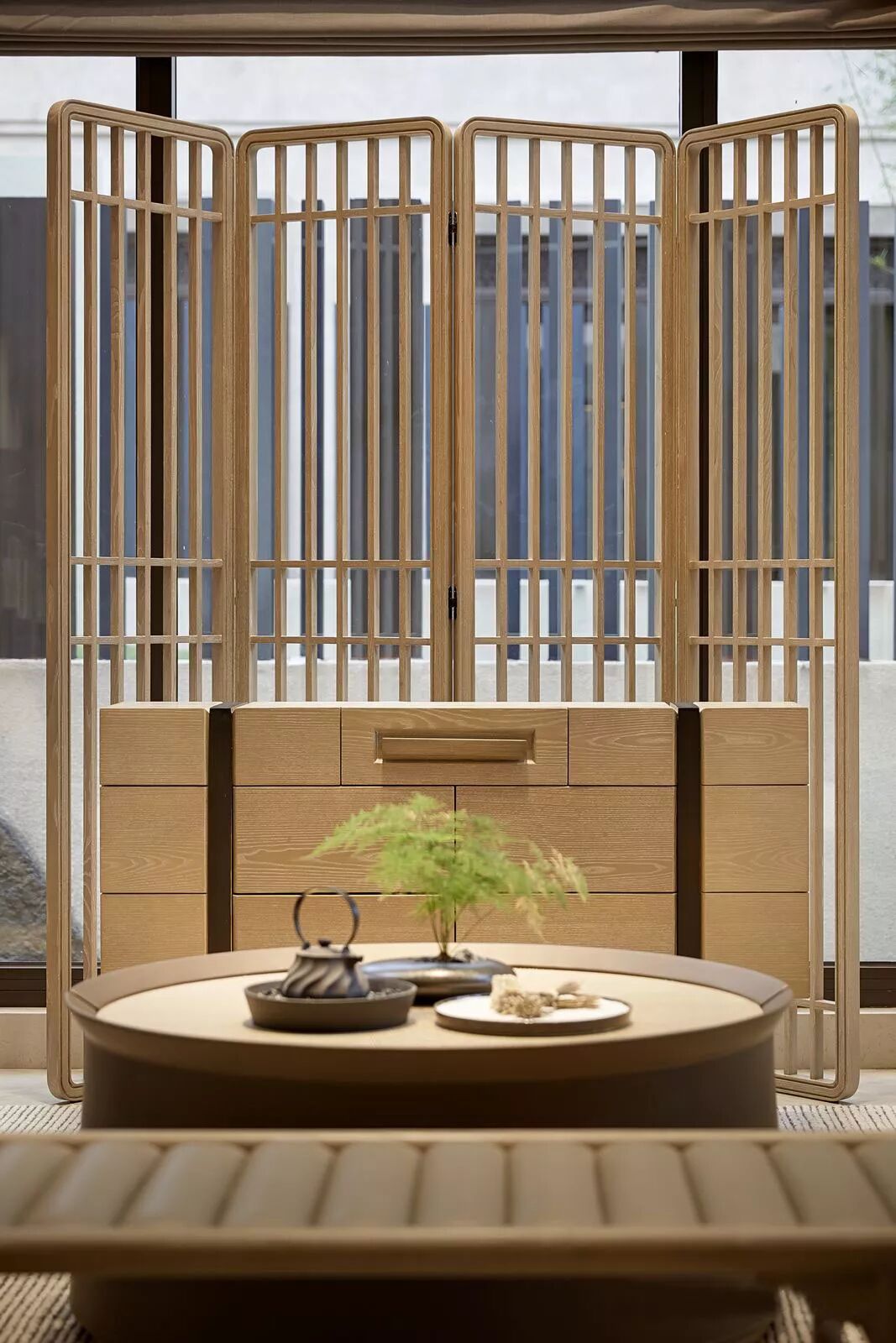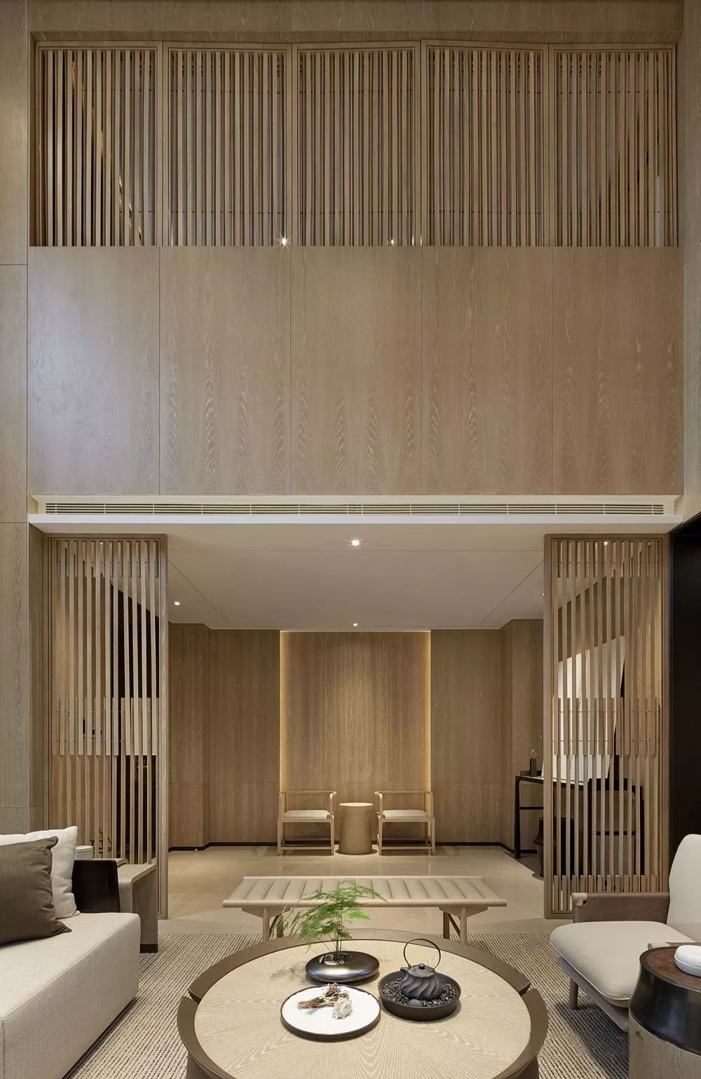 客厅设计更加偏向舒适的功能性、开阔明亮,无论是墙壁还是格栅,都以线性的原木色示人,它们柔和的出现在空间之中,软化了棱角,亦让人不禁想起了竹,即谦谦君子又温情脉脉。