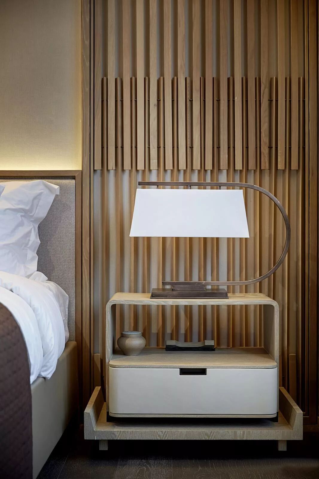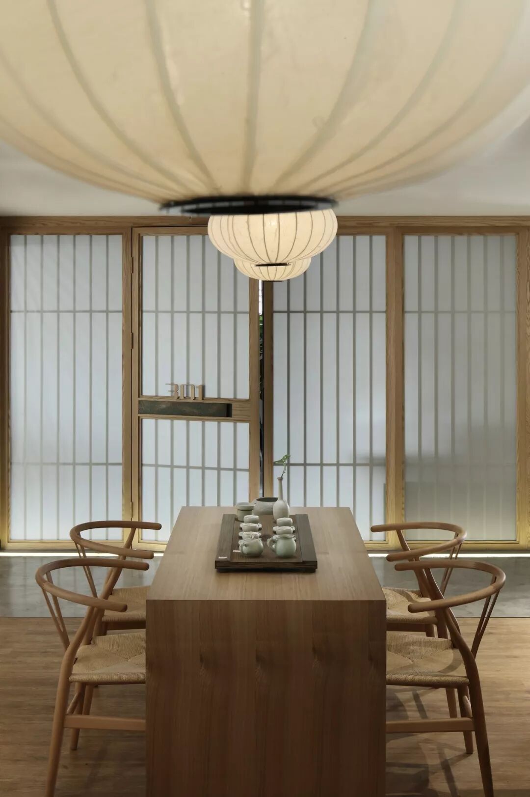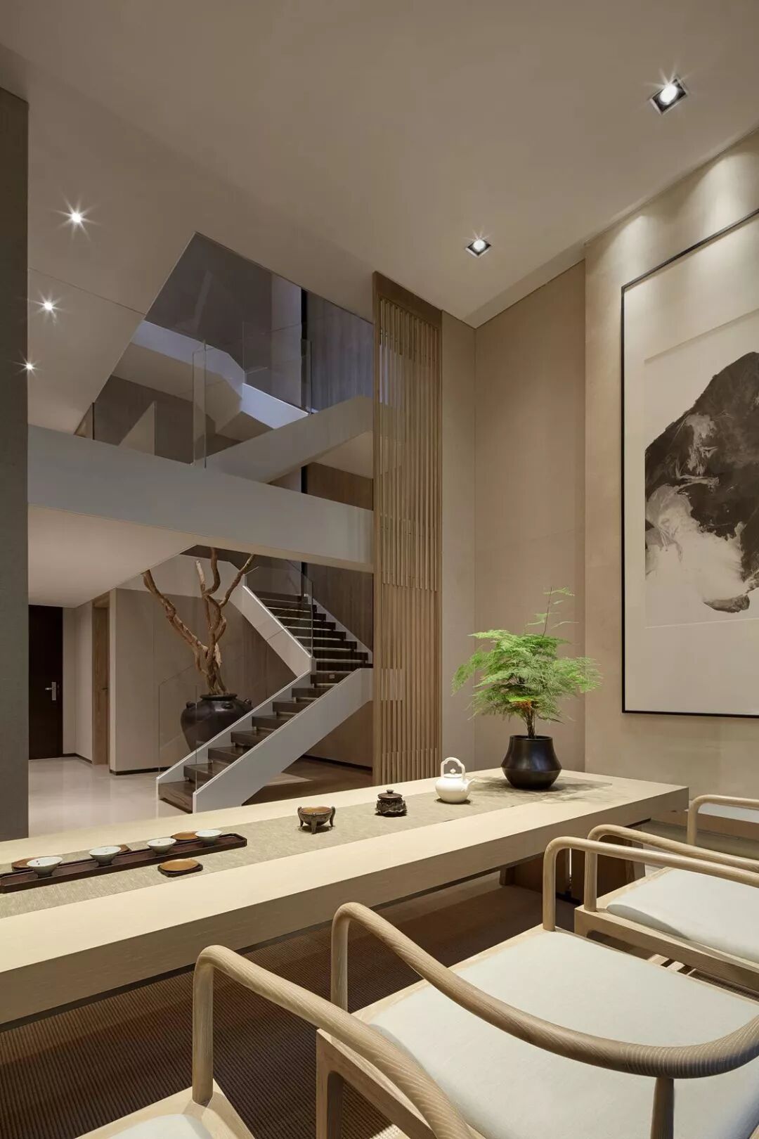 客厅设计更加偏向舒适的功能性、开阔明亮,无论是墙壁还是格栅,都以线性的原木色示人,它们柔和的出现在空间之中,软化了棱角,亦让人不禁想起了竹,即谦谦君子又温情脉脉。