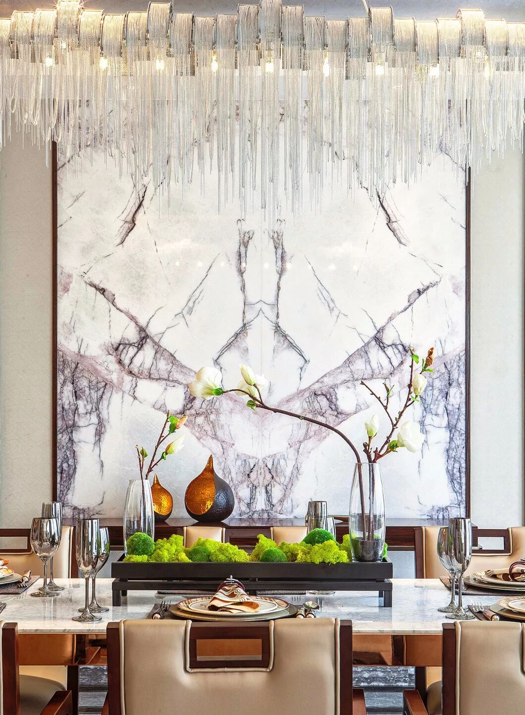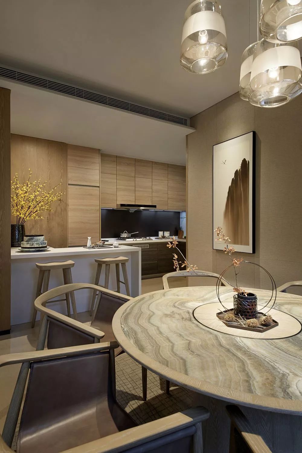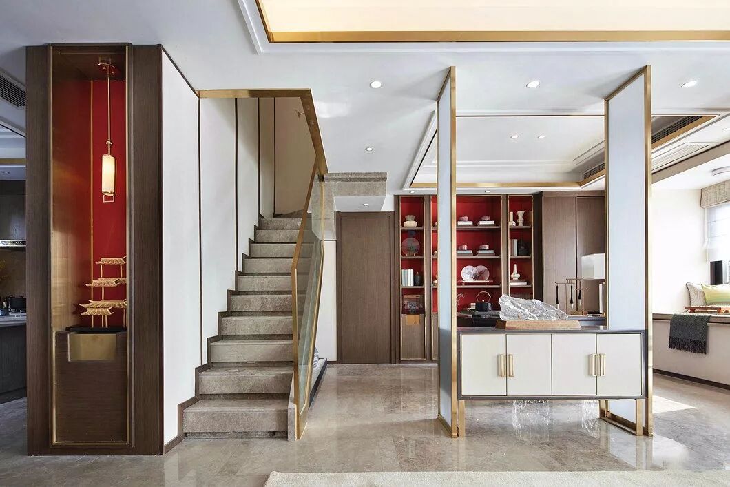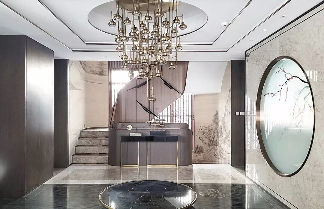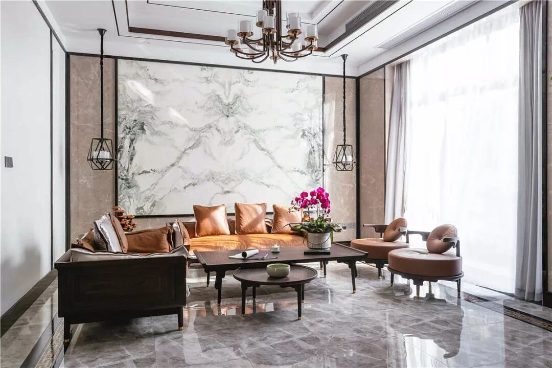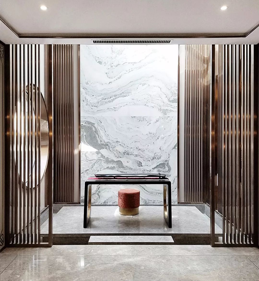 但拥有轻奢气质的中式风格,在选材上则大胆地加入一些现代材质,如金属、玻璃、皮质、大理石等,让空间在保留古典美学的基础上,又进行时髦的现代演绎,使空间质感变得更加丰富。