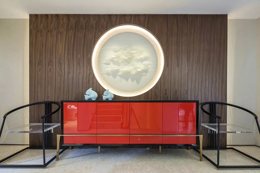 带有轻奢风格的中式家居,多以深色为主,在黑白灰的基础上又辅以红、黄、蓝、绿等亮色作为局部点缀,配色更加大胆、明快而富有个性,风雅韵味呼之欲出。