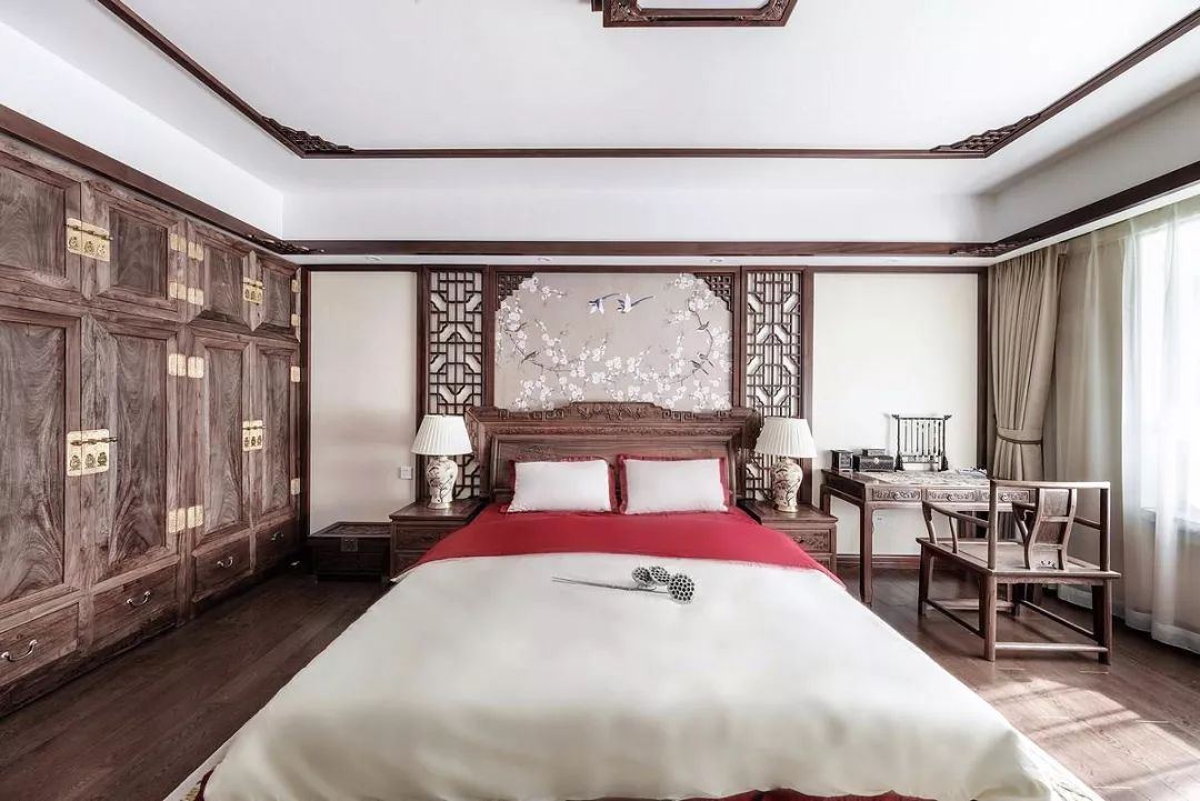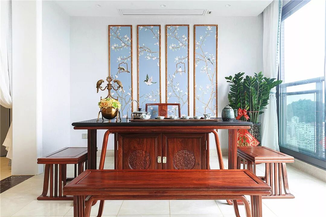 而选择造型简约的新中式家具,则会大大消除视觉上的压抑感。