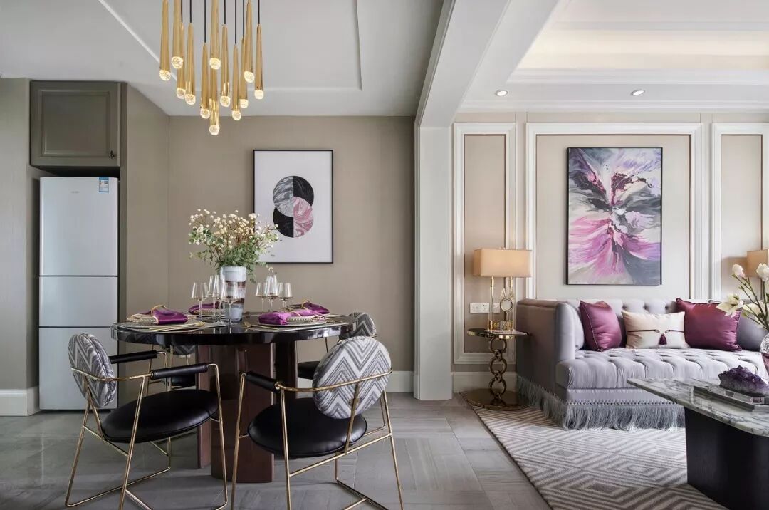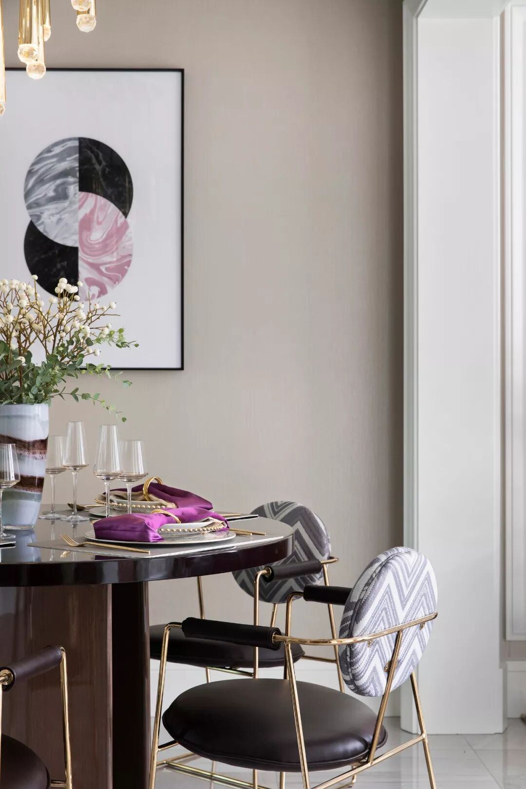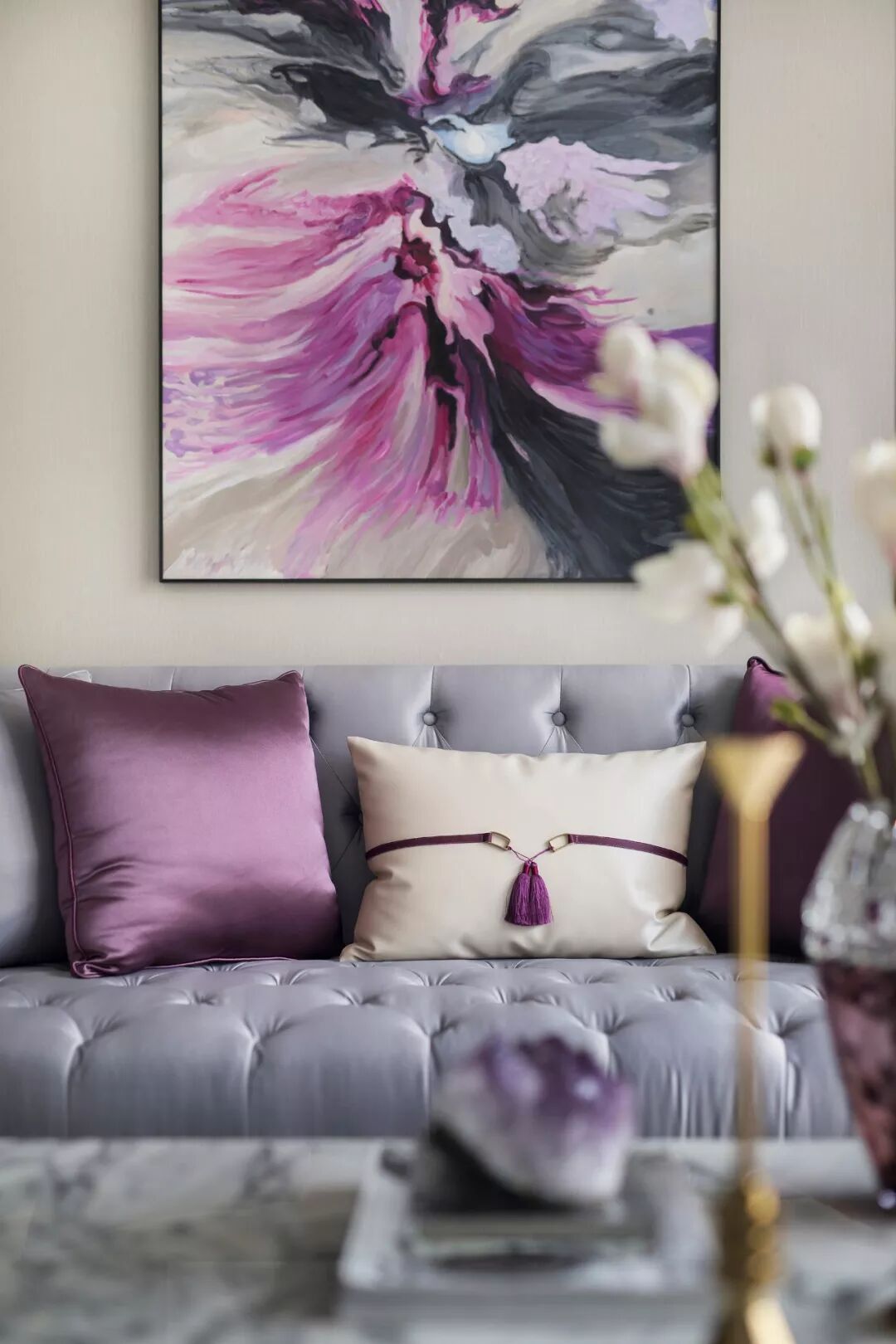 空间在低调优雅的灰白基底包围之下,紫色温婉装点,弥漫一室浪漫情韵。气质典雅的欧式护墙板置入空间,分隔客餐厅的界限。沙发上的流苏点缀,就像乐谱上巧妙安排的装饰音,令空间的旋律舒缓而灵动。壁上相对的挂画,一幅是色彩的恣意相融,宣扬自我;一幅似倾洒而出的酒香,妩媚迷人又轻雅愉悦,自然而然地渗透到每个角落。