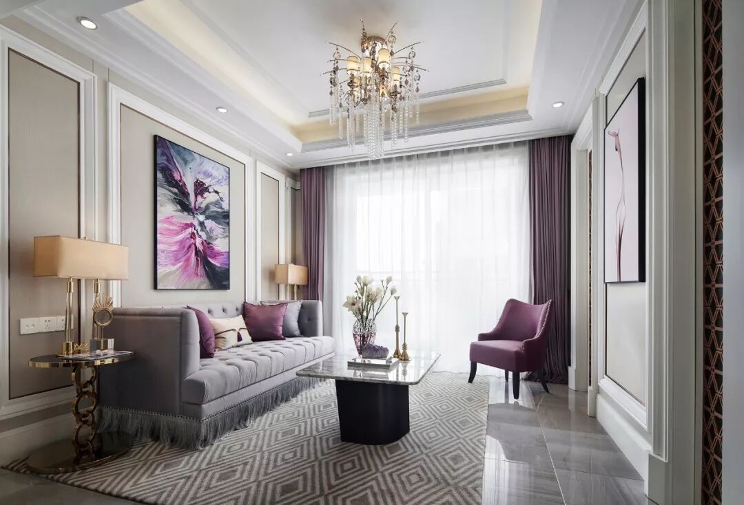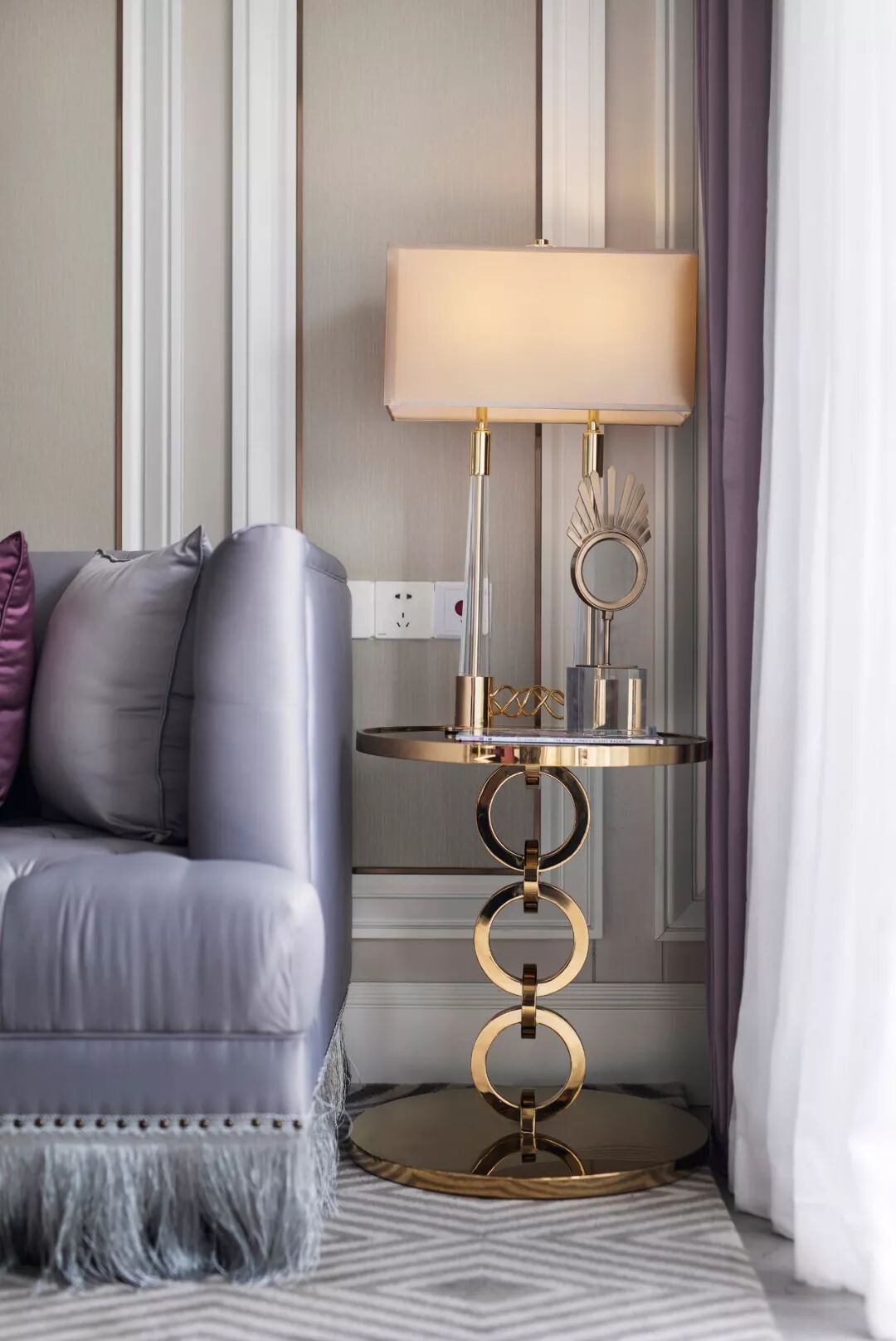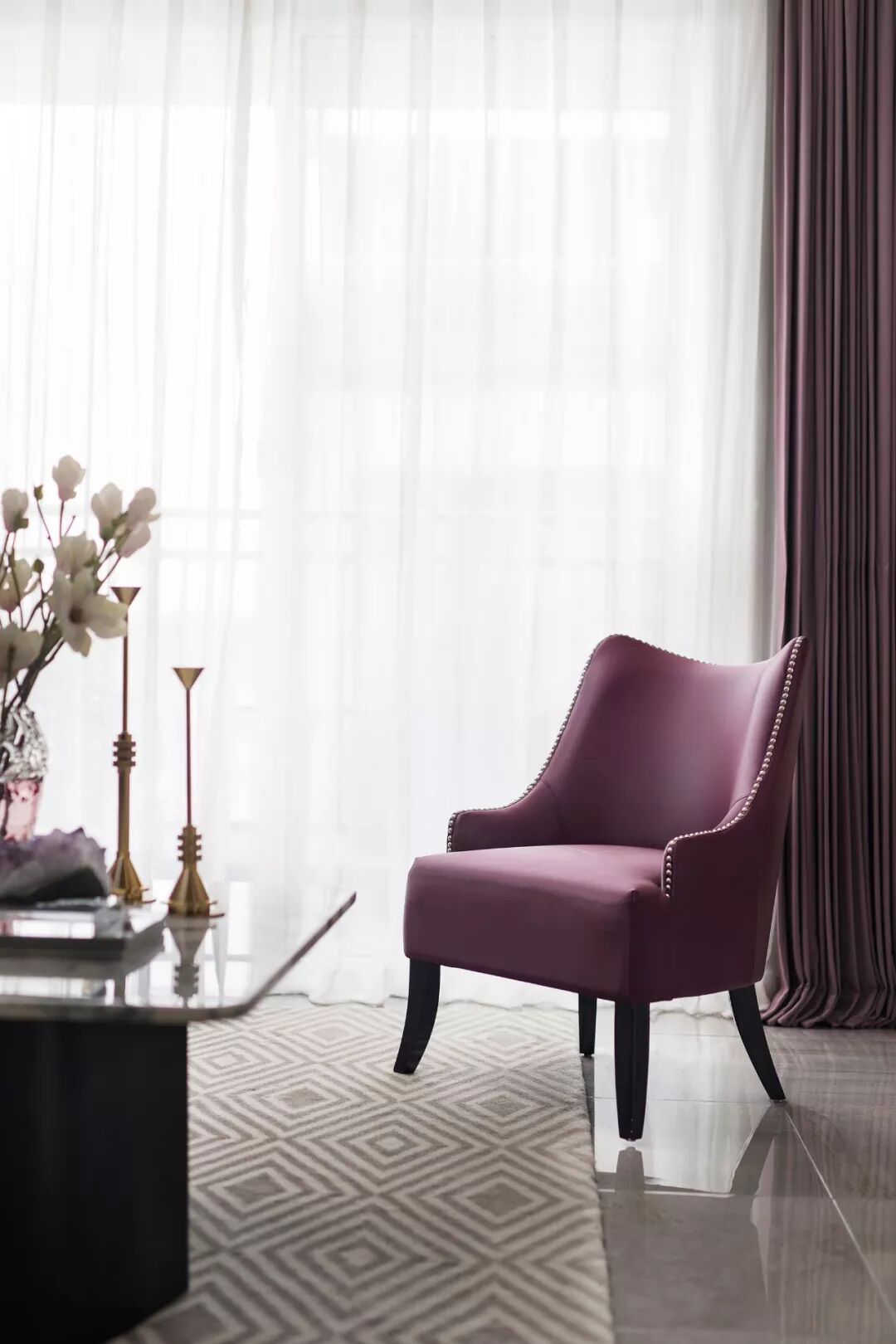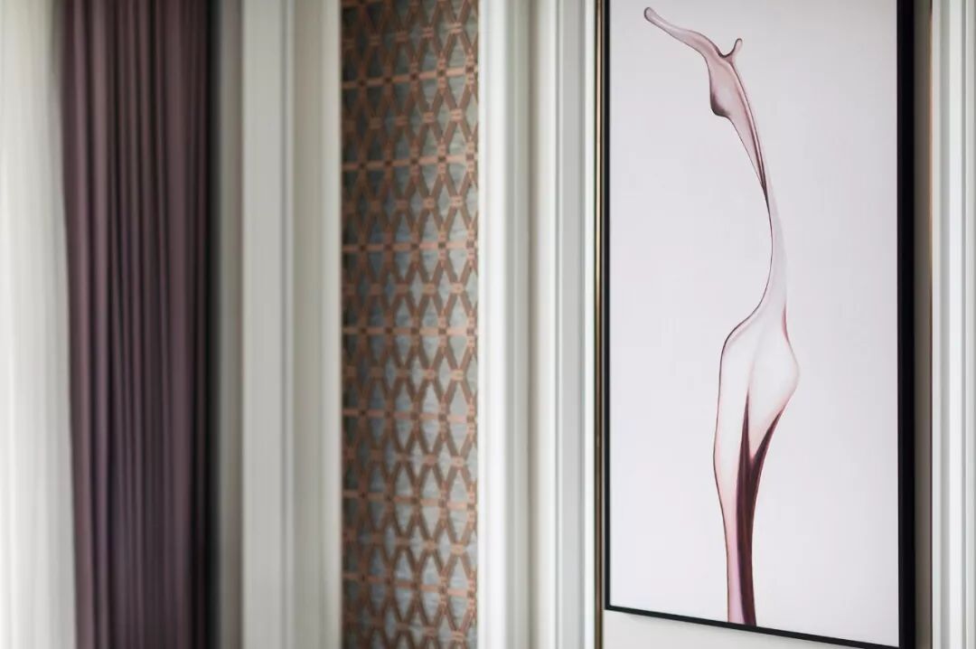 设计以霜灰色的素雅糅合紫色的浓郁,形成法式的优雅气韵,犹如柔光下轻扬起的一曲华尔兹,滑步旋转间,绽放出居室旖旎浪漫的情绪。绸缎与丝绒的轻柔,卷裹着金属线条的典雅质感,此间的韵律,似是琴弦上的音波,流流转转,令人迷醉其中。