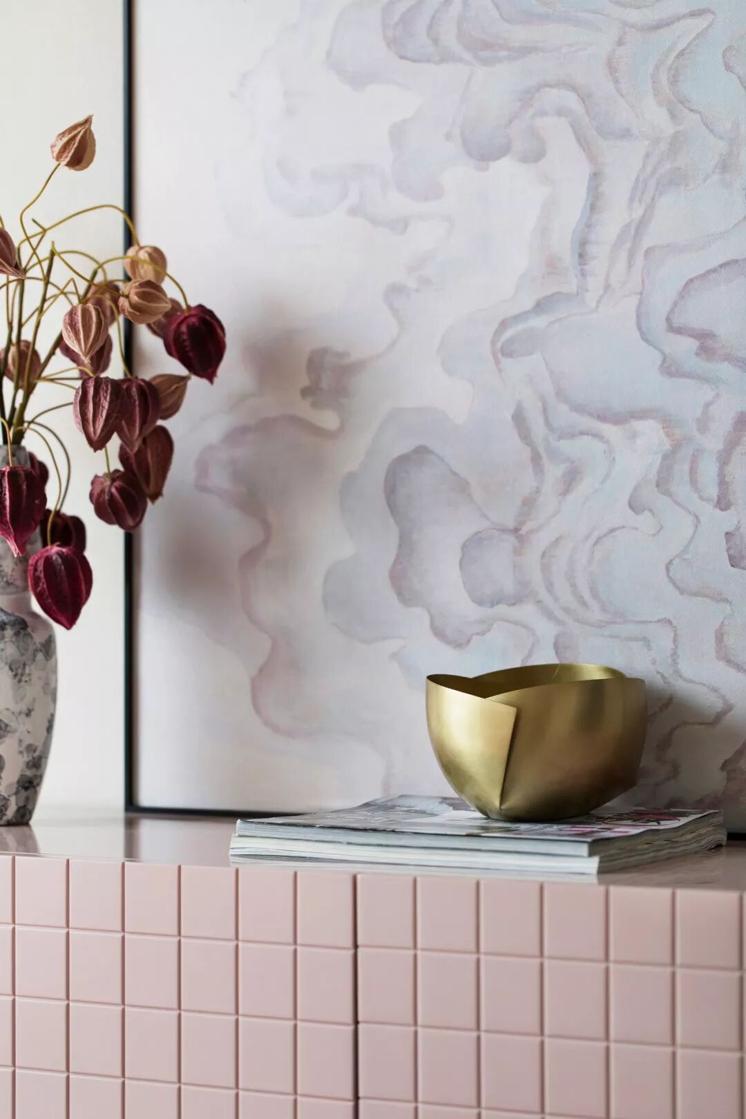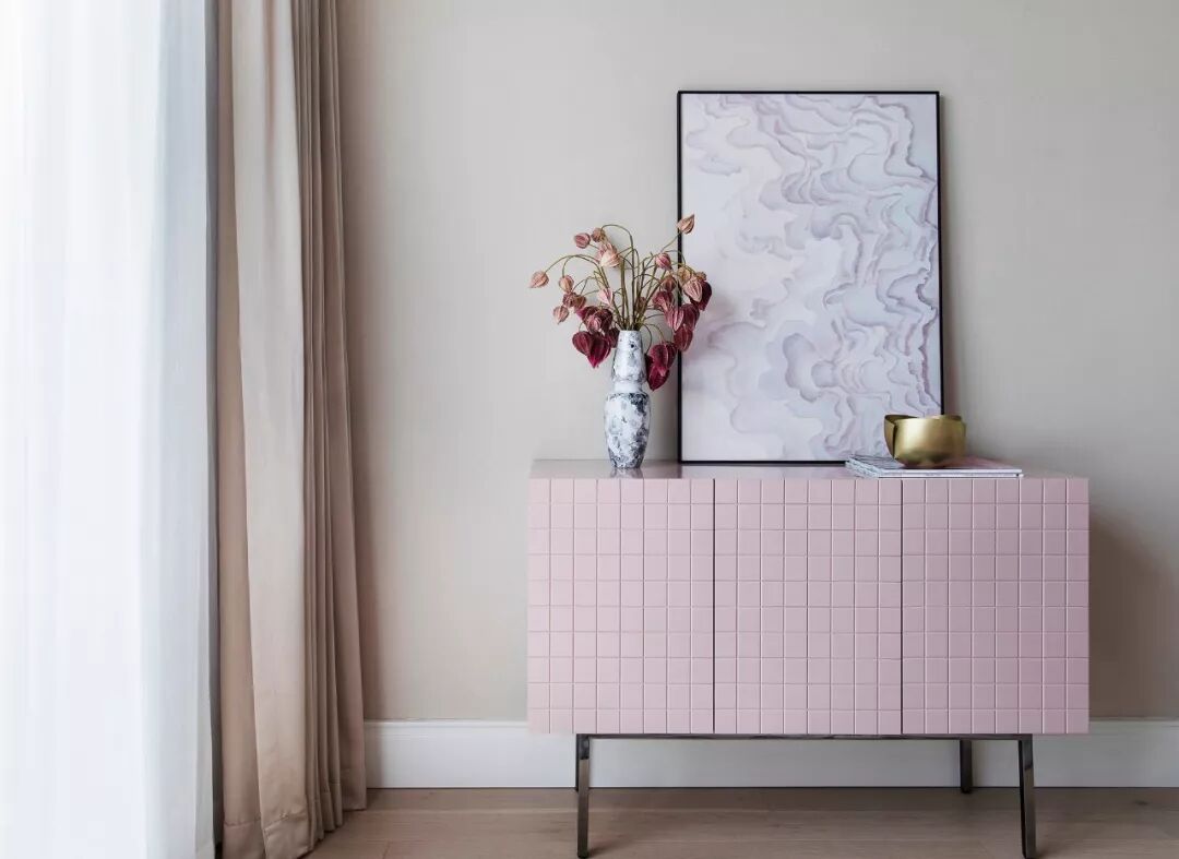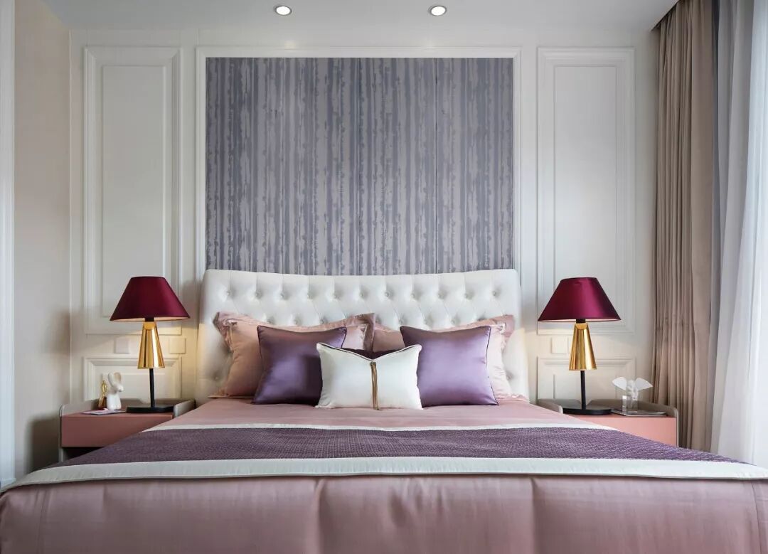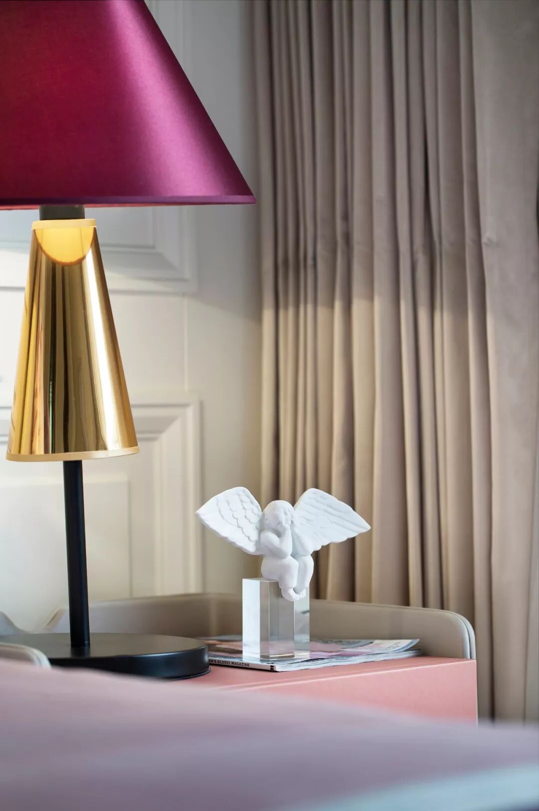进入主卧,装饰消逝无存,取而代之的是空间及浅至深的色彩语言——烟粉、香芋紫、嫣红。色调层层推进,与材料语汇融合缠绵,令美的余韵从渐变韵律中焕发出来。壁柜上马赛克图纹与藕粉色的碰撞、小灯笼似的花艺、勾勒着梦幻色彩的画饰,含蓄的美感于其中悄然而生,轻语空间不朽的浪漫诗意。
