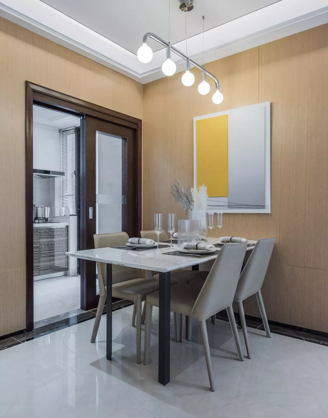 用膳空间以简约造型装饰墙面,丰富空间的同时,大而不空、厚而不重,营造出干净整洁、有格调且不压抑的视觉效果。