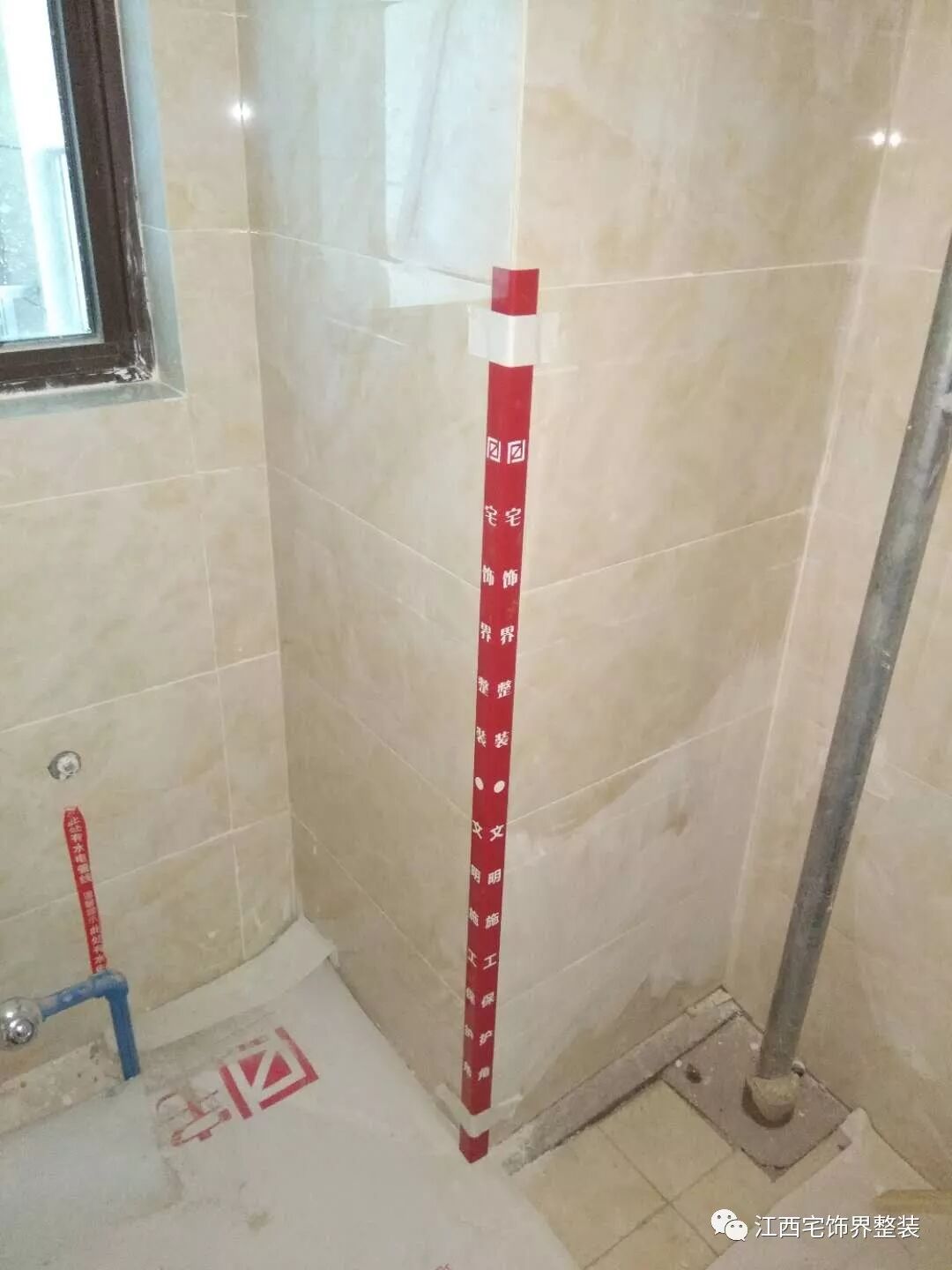 瓷砖铺贴平整,无空鼓,现场也非常干净整洁;水电走向标识精准,墙边保护到位。