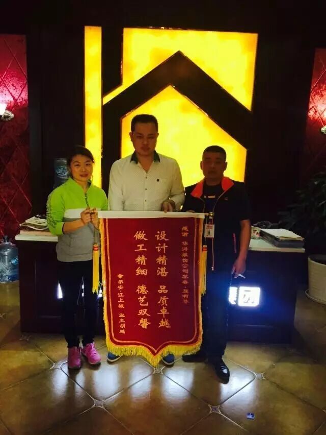 胡哥是江上城的业主,由屈工设计师负责全案设计,工程监理黎工全程监管服务。客户去年11月中旬开工,元月份正式完工。在这两个月的相处中,客户感受到了我们的专业与真诚,亲自赠来锦旗以表感谢。胡哥热情地表示:“感谢华浔员工认真负责的服务,我们对华浔的装修非常满意,今天来送这个锦旗,完全是我发自内心的感谢,感谢华浔为我们家装修的付出和细心服务,正如锦旗上实实在在的写的:“设计精湛,品质卓越,做工精细,德艺双馨”