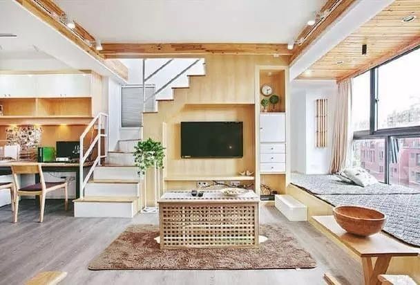 ▲ 小清新风的背景墙,浓浓的日式风舒服又顺眼,配合楼梯进行设计,不仅好看,还大大利用了死角空间!