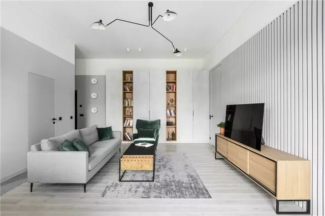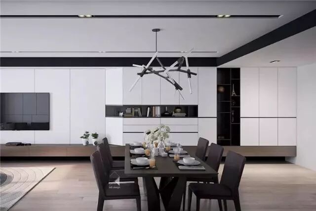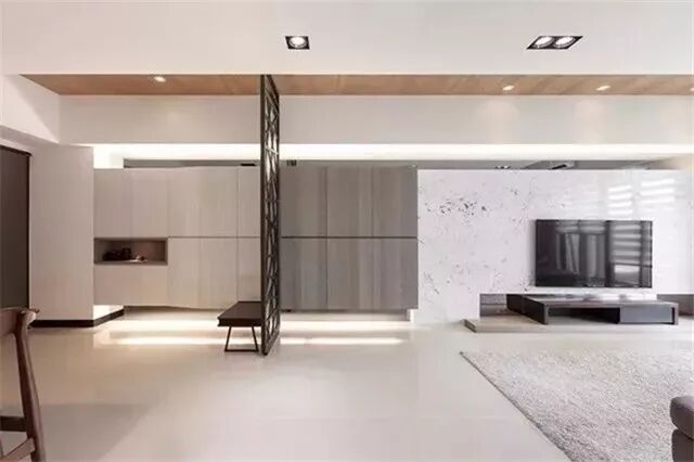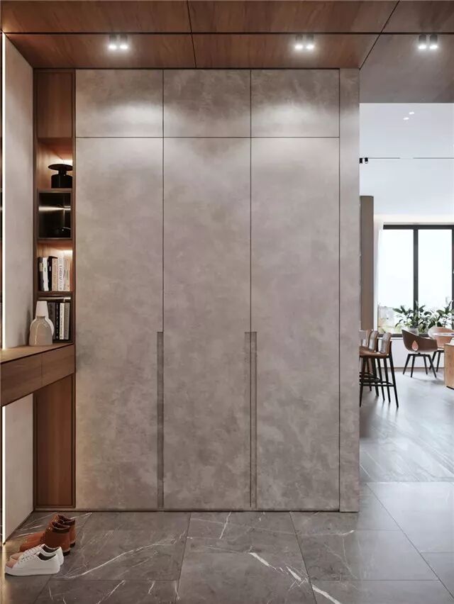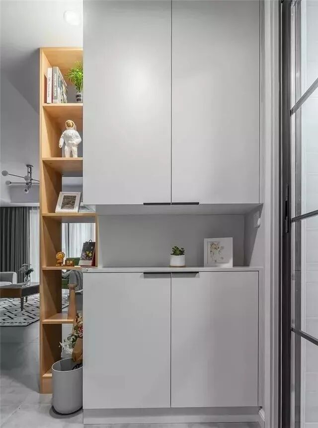 但是,并不是每一种户型都适合用鞋柜来当玄关,也不是每个户型都可以用这种方法来化解尴尬,不是每一种开门见厅的户型,都可以通过设计一个假玄关来化解的。有些客餐厅连在一起的户型,有很强的空间感,可以贴墙设计一整排柜子,这样不仅实用,而且非常节省空间。