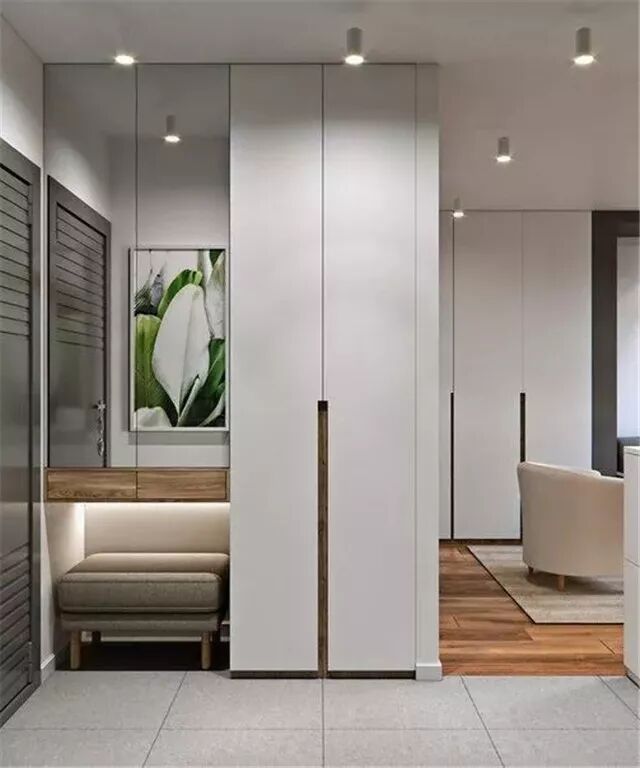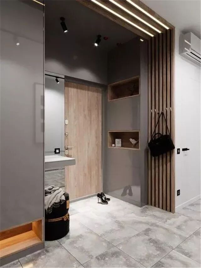如果面积太小,无法放置鞋柜,可以观察一下侧面的墙体是否为承重墙,如果不是,可以拆除部分墙体,设计成一个柜子,上部分放衣物,下部分放鞋子,增加收纳能力。会非常的方便,省去了柜门,这样更换鞋子的时候就可以,不需要打开柜门,随手拿出自己需要穿的鞋子,如果增加一个换鞋凳就更加完美了。为了打造更好的隐蔽性,可以在门的旁边做一个透明玻璃,不仅不会阻挡光线,看上去还会比较的美观大方。