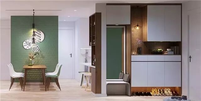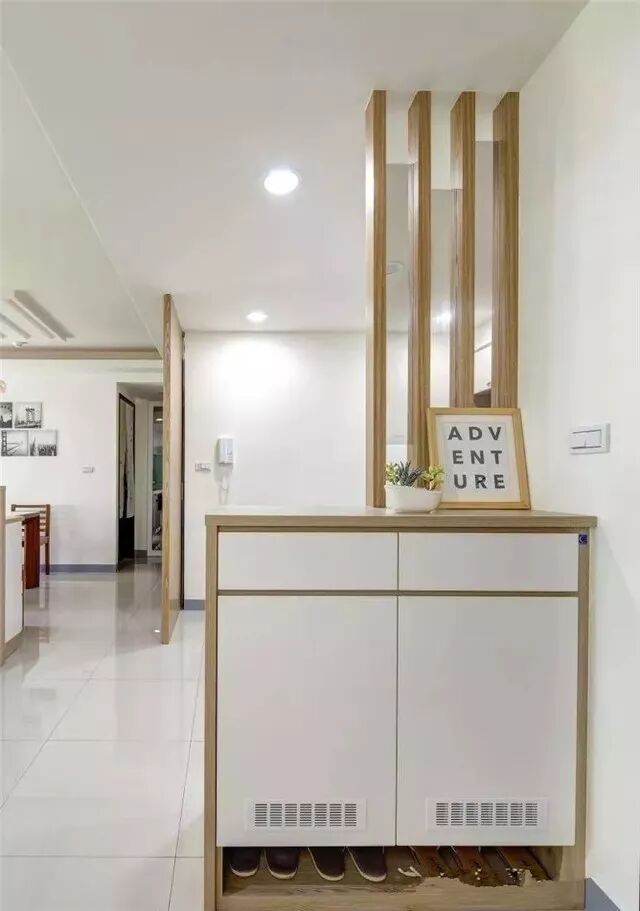 大部分户型,一进门就是客厅或者是餐厅,但是门框和垂直墙面之间会拥有一一定的地方,在这个空余的位置就可以摆放一个鞋柜。非常的方便,而且整洁。