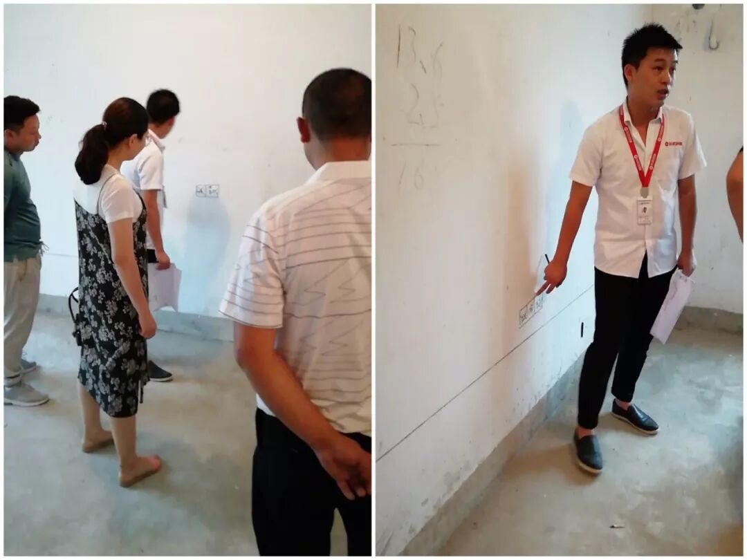 现场设计师、其他工作人员与刘女士进行交底。交底的过程,是为了让业主清楚的知道自己家的房子哪里需要改动,哪里怎么装,装什么。现场也会针对一些不清楚的问题,与设计师进行再次确定,以保证房屋顺利进行施工。
