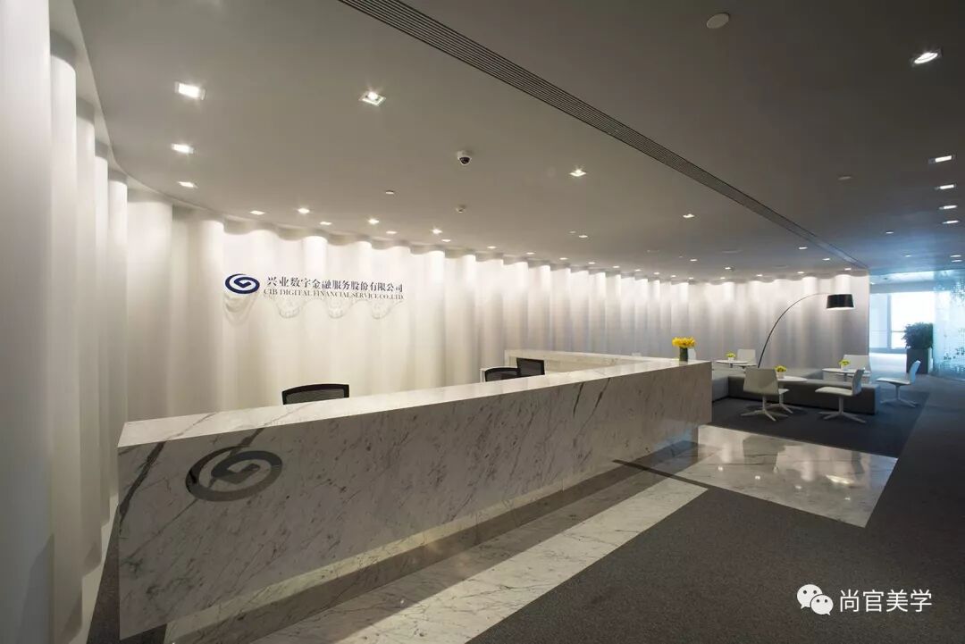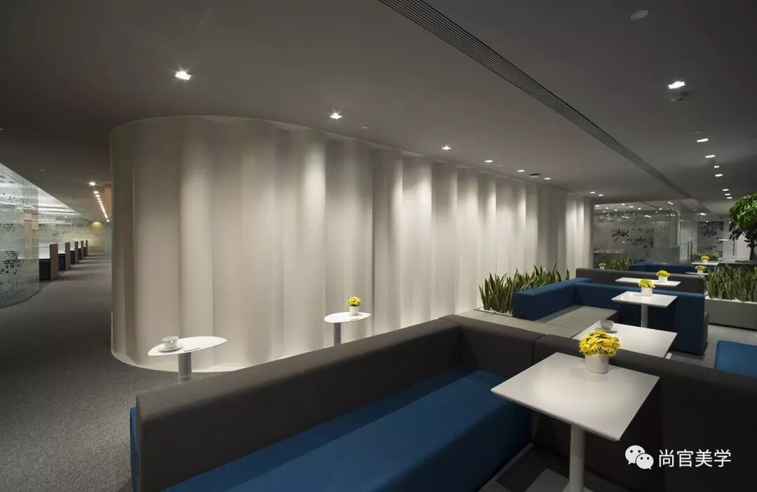 波浪状的背景墙赋予数字金融公司些许科技感,此外营造出一种无限延伸的动感来,打破沉闷。