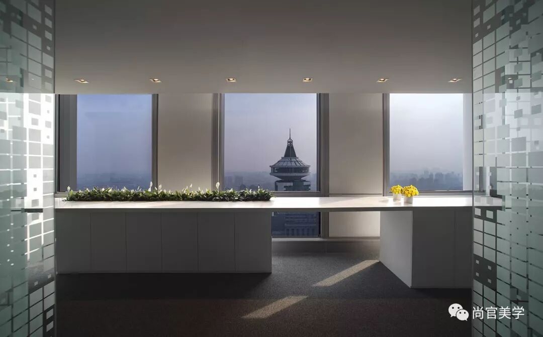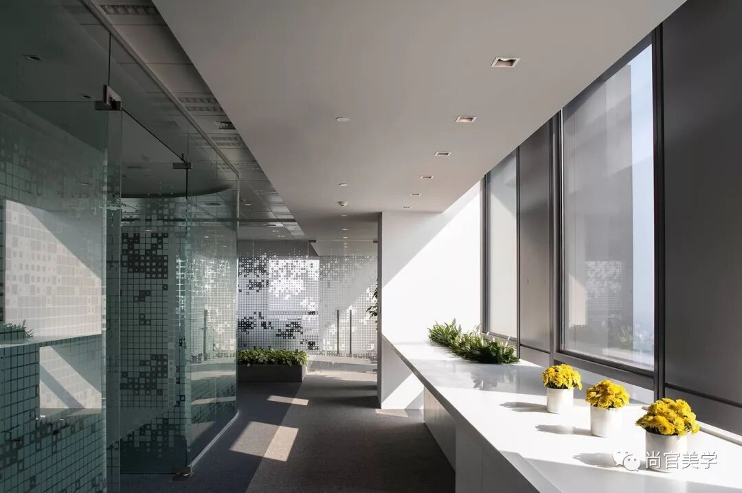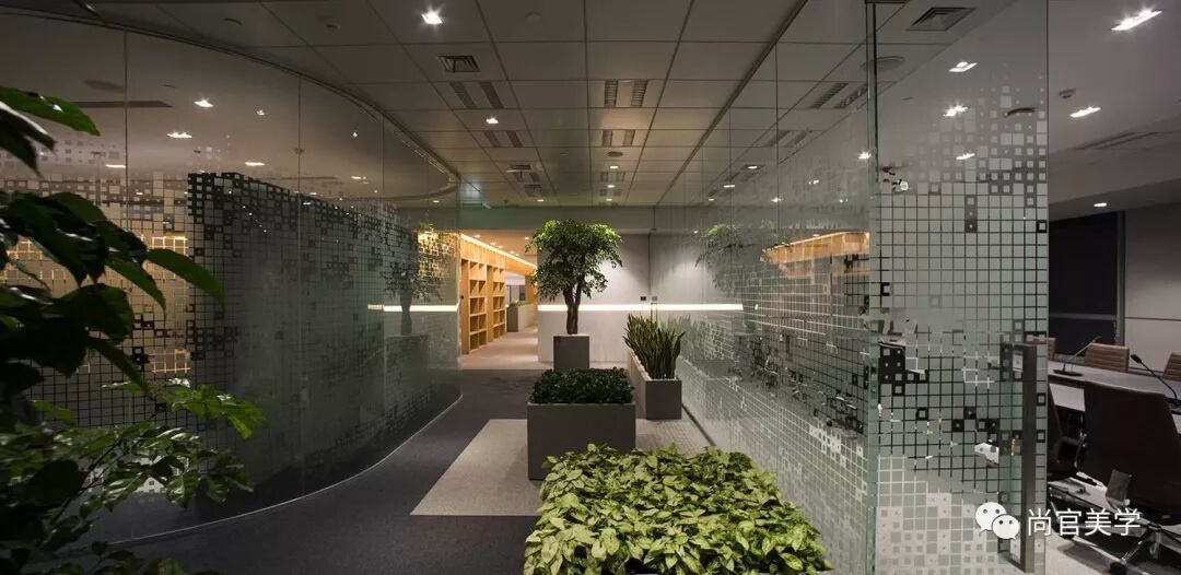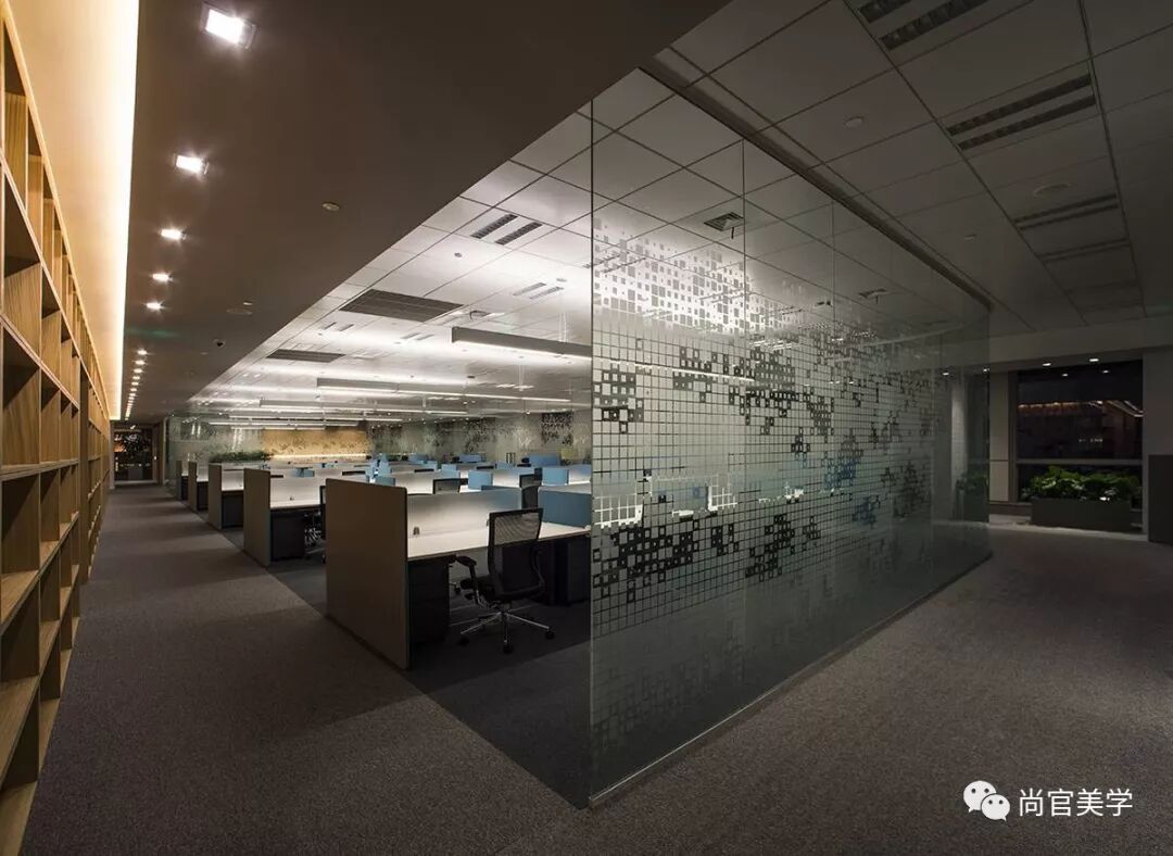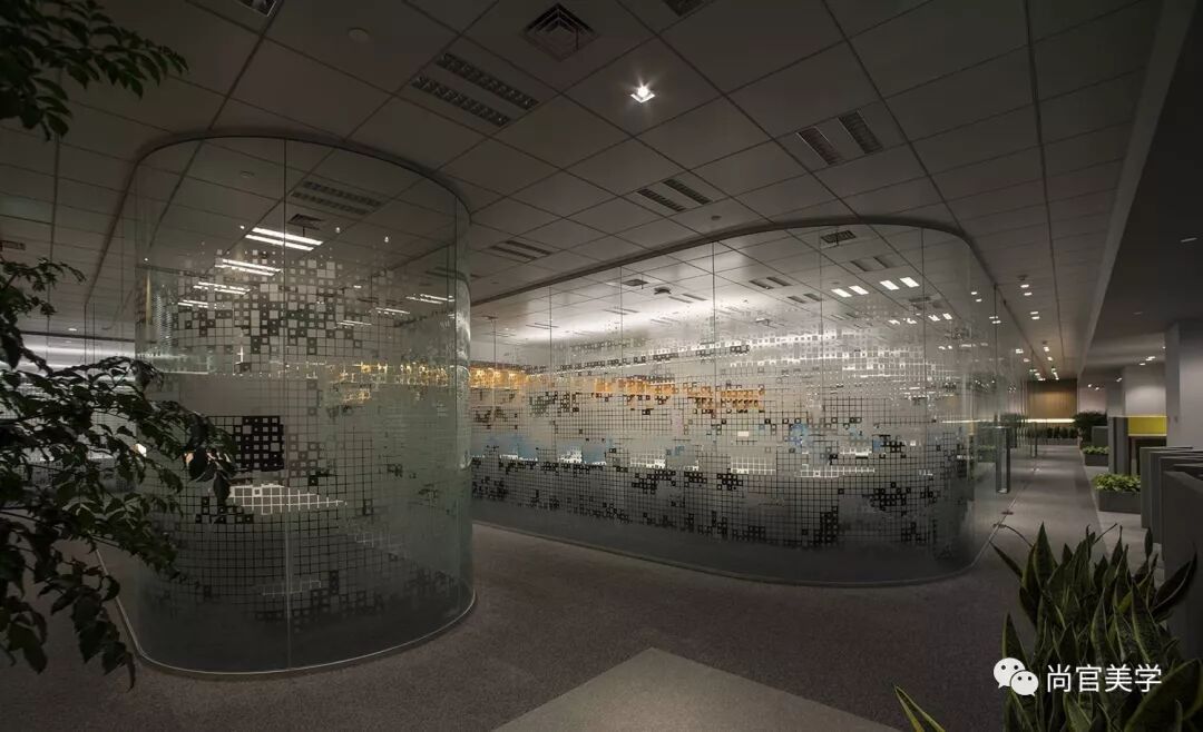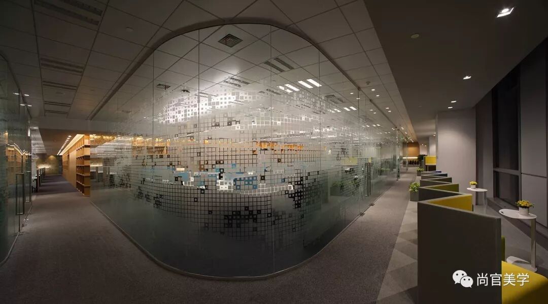 曲面玻璃延续了设计师的流动理念,柔化办公的生硬棱角。数码感花纹再次体现科技感,半遮半掩的视觉效果,妙不可言。
