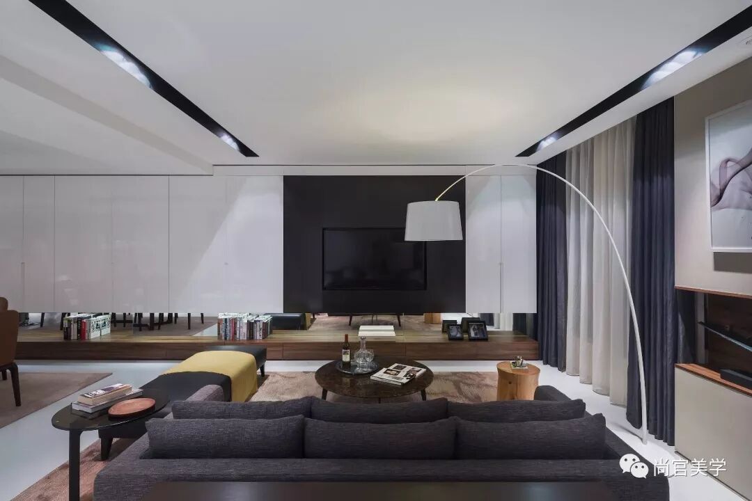 黑色平行对称的射灯灯槽点缀了白色石膏平顶,电视内嵌于黑背景墙中,具有整体性。