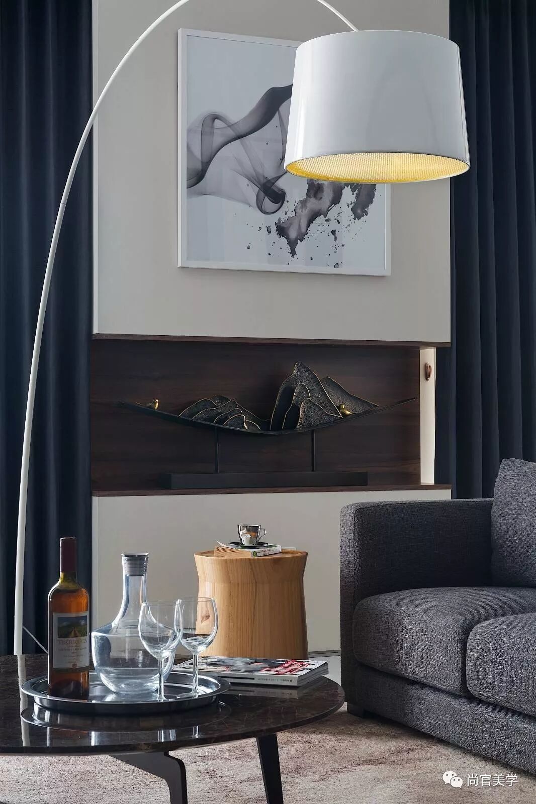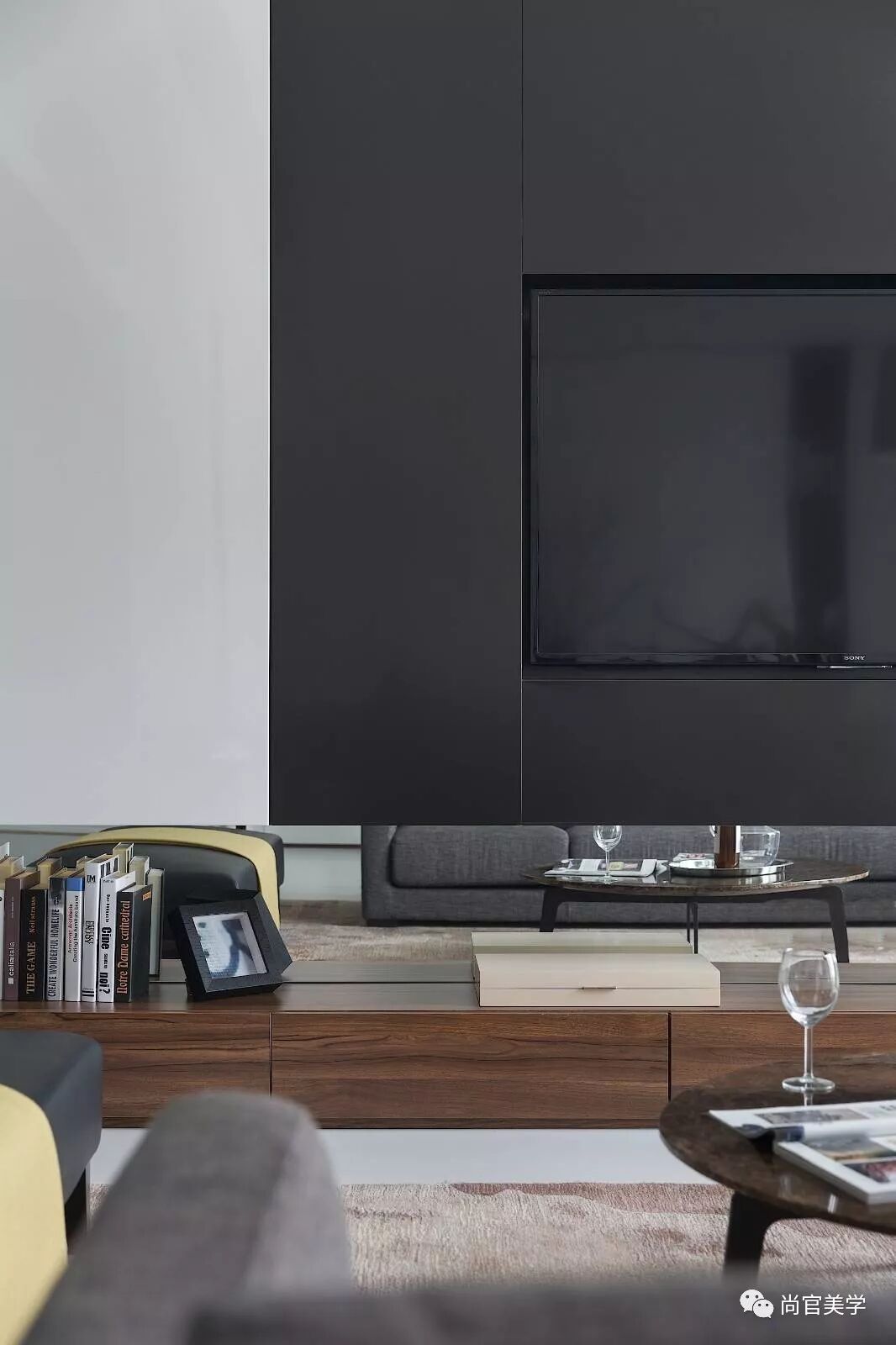 电视机嵌入黑色背景墙,画面具有整体性。家具偏向于线条简单,设计简洁之物。