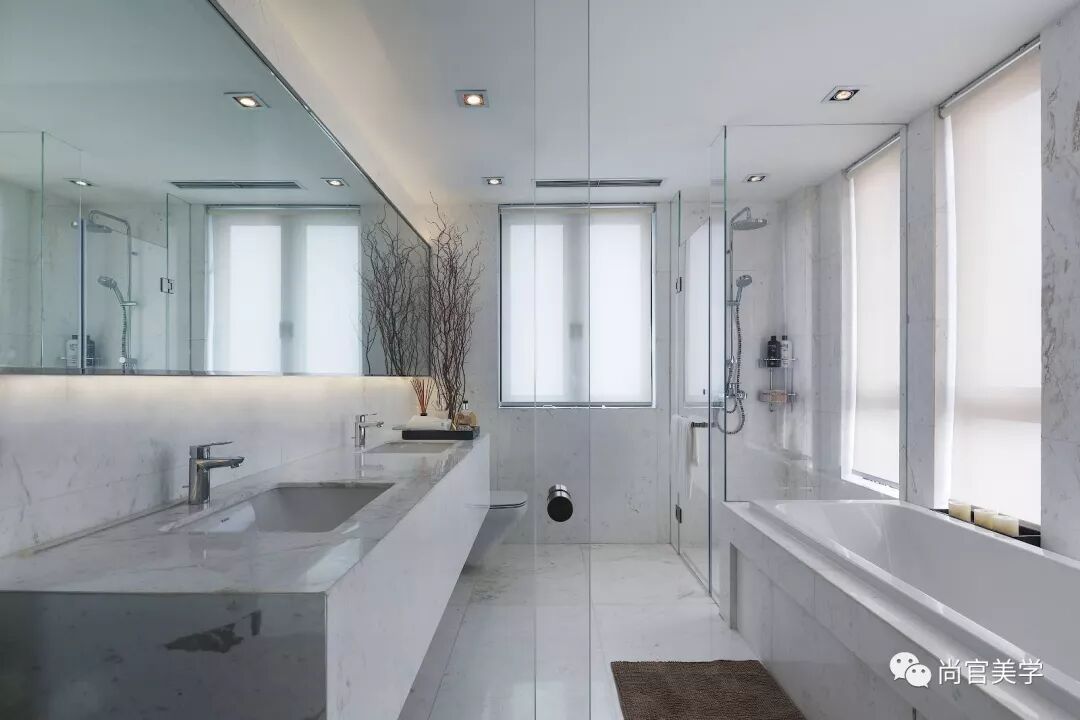 防潮石膏吊顶,浅色大理石贴面显得空间整洁。玻璃移门让视觉毫无遮拦,一眼便可将空间尽收眼底。