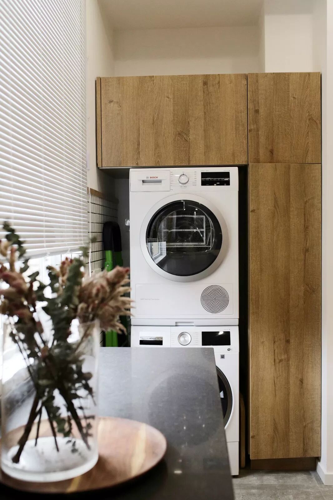 说完高柜,咱们再来按照动线顺序依次聊聊其他区域,厨房最右边的角落叠放了洗衣机和烘干机。
