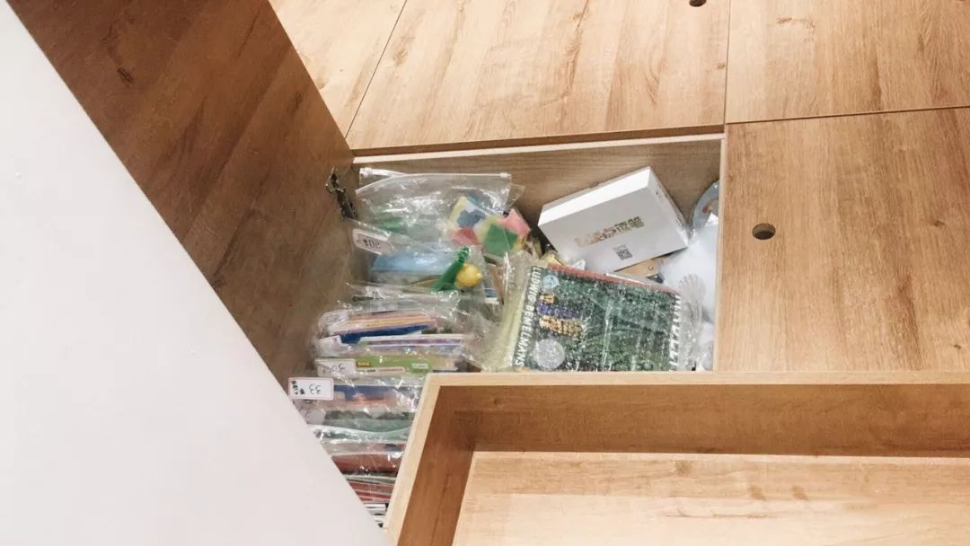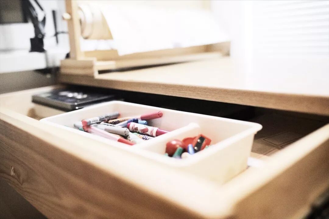两个小抽屉也各有分工,右边放Singgie的手绘工具,左边是孩子们的蜡笔和画笔。