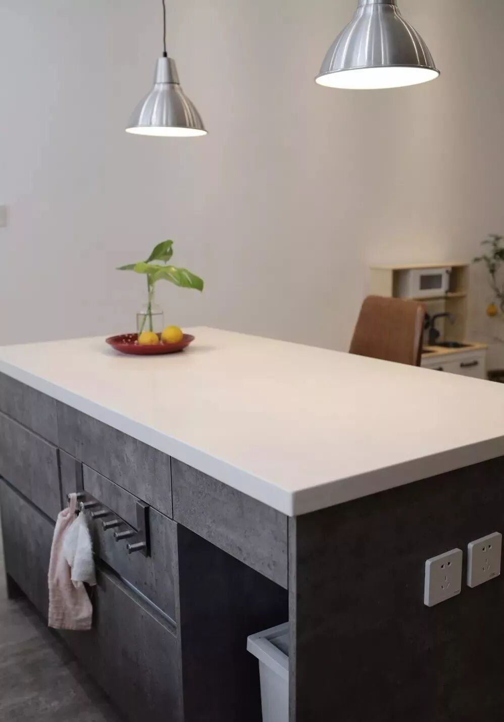 白色台面+很像水泥的岩板面板组成了这个中岛,没有选择和橱柜比较搭的原木风中岛,主要是Singgie更喜欢这俩组合。