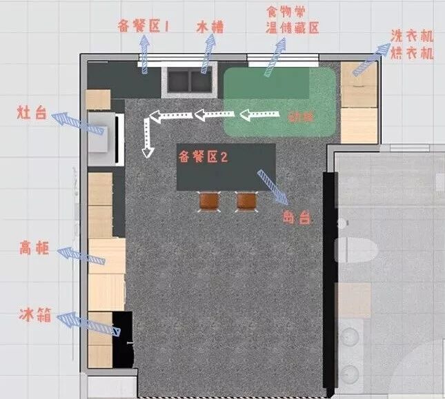 厨房最后呈现为L型,洗菜——切菜——炒菜——盛菜,动线流畅,一气呵成。
