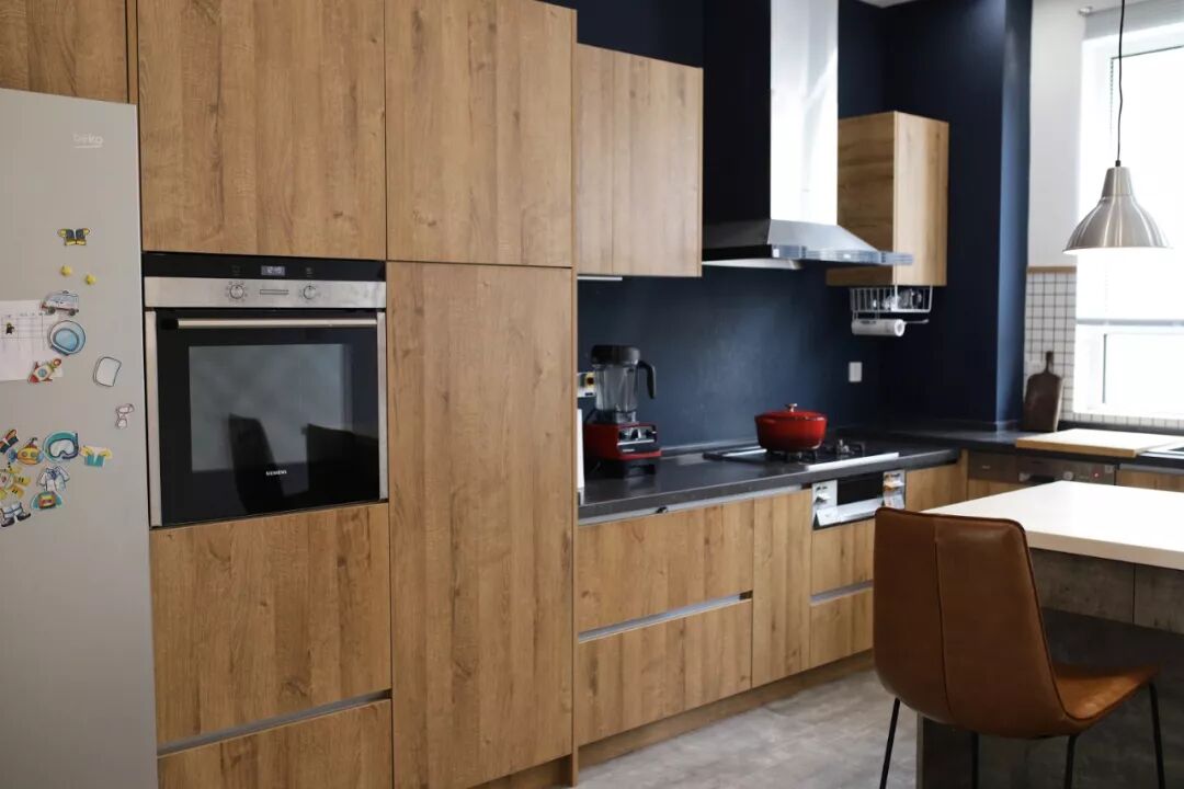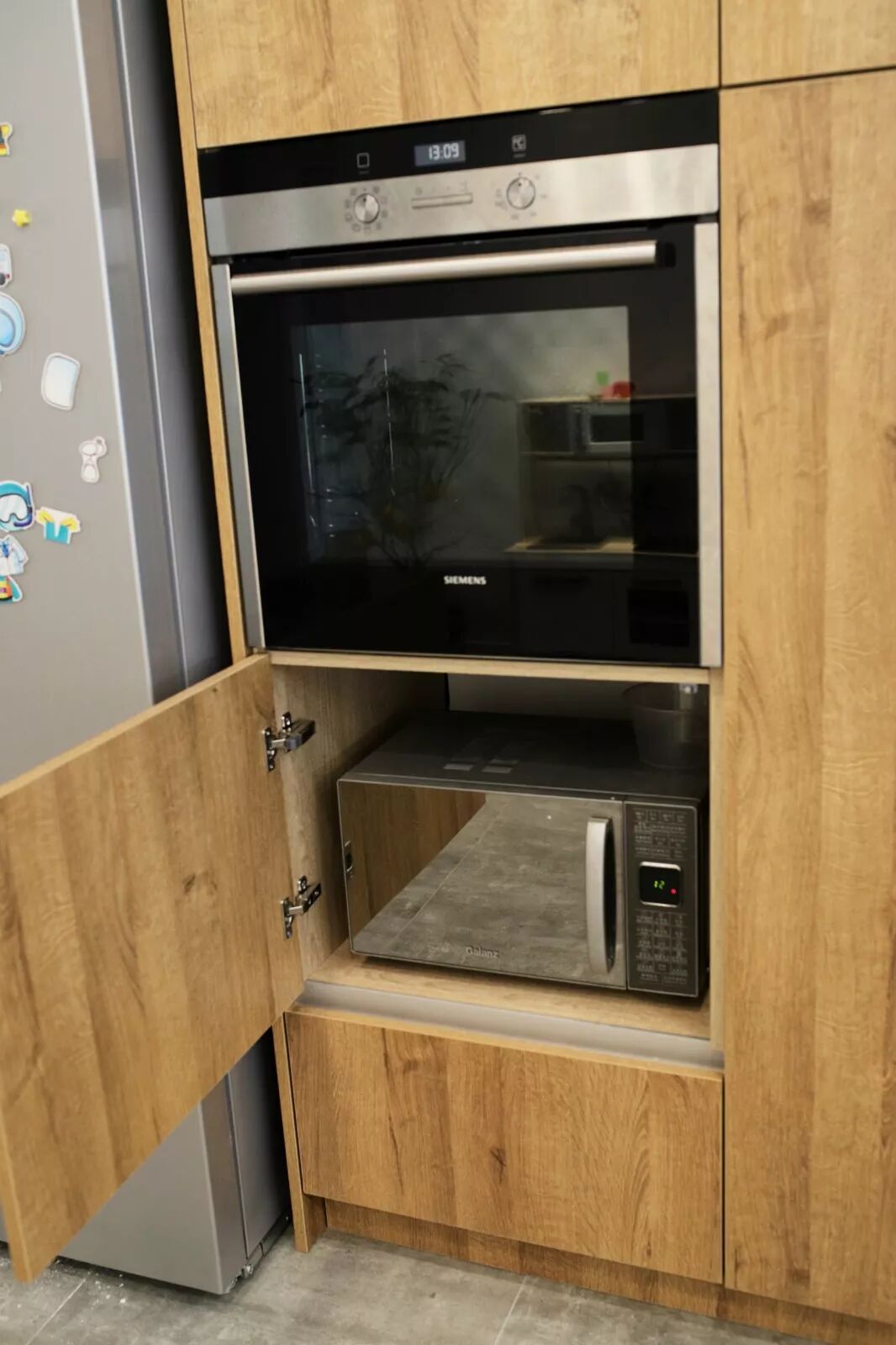 冰箱、烤箱直接嵌入隐身,打开柜门,烤箱下面还藏着微波炉。