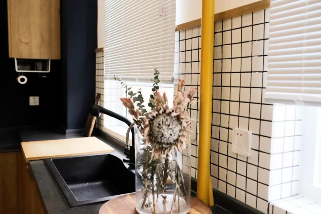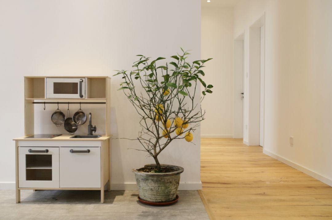 厨房另一面则保留了白墙,旁边简简单单地摆了一颗柠檬树。