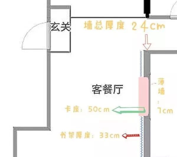 墙的厚度是24cm,书架深度33cm,所以为了嵌入卡座又在中间凿个洞,起了一面7cm的薄墙。