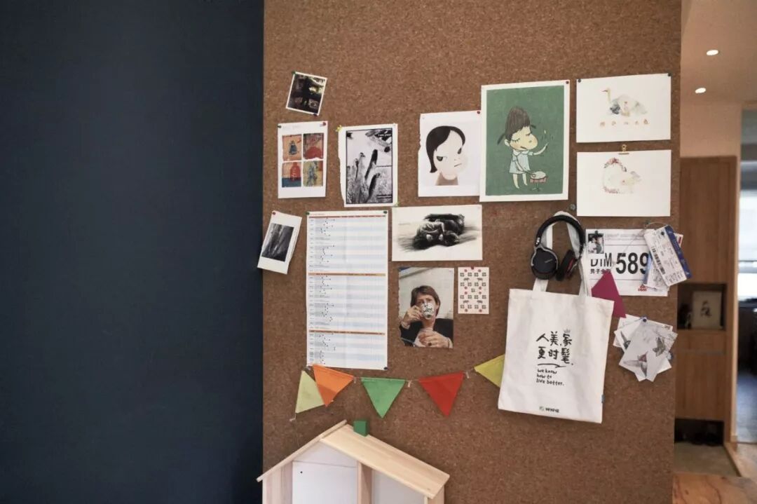 桌子对面是一面软木墙,藏住了弱电箱和路由器,又随便钉了一些照片和手绘,也很好看吖。