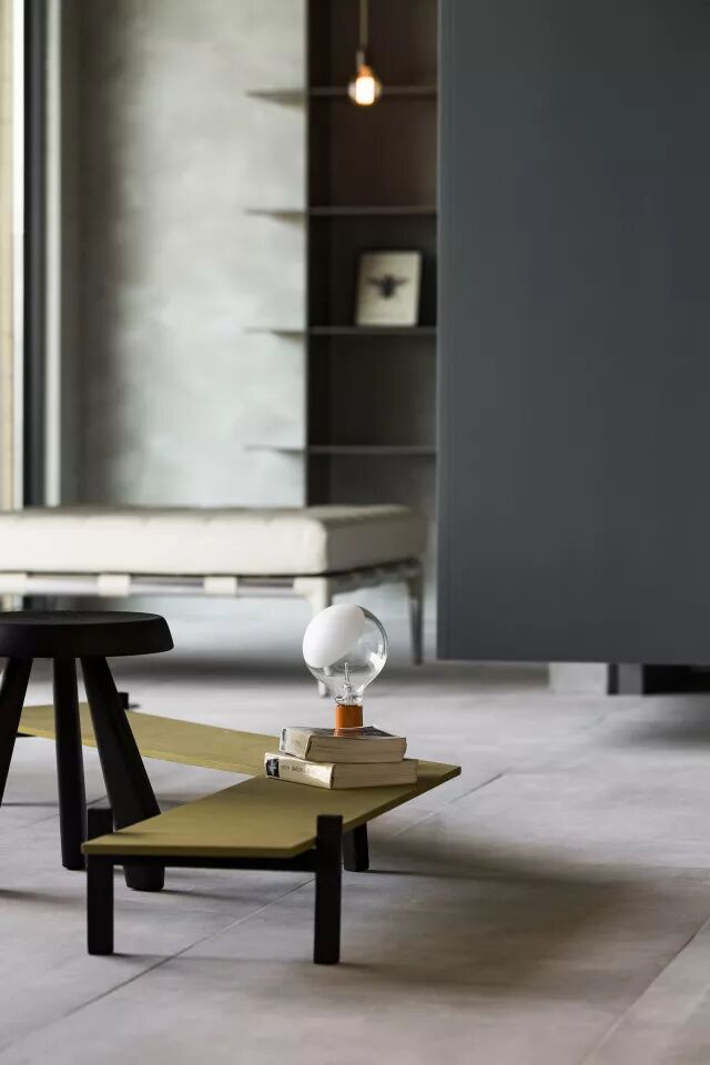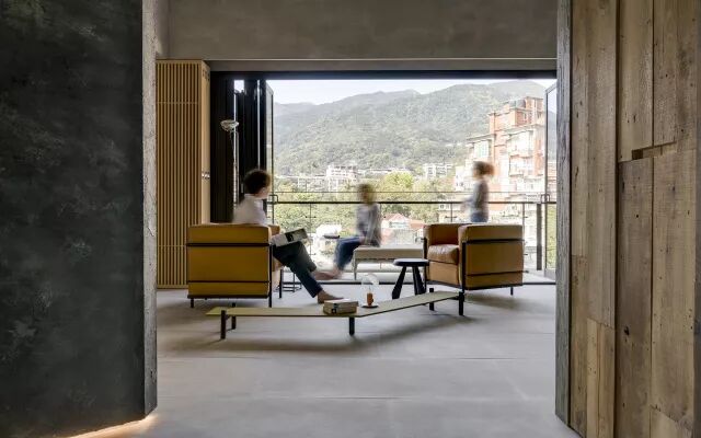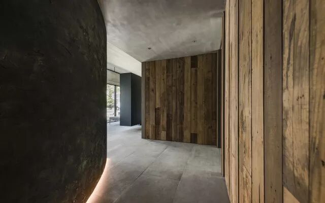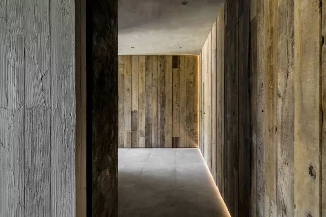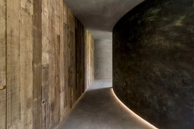 空间里弧形结构,使其动线增加流畅感及变化性,除了满足收纳功能外,设计者以雕塑方式将其弧形表面塑造为一面具有岁月凿痕的创作品,层迭的灰黑色塑土里带有陈旧感的锈铁及隐隐的金箔,以线性的光带搭配台湾旧桧木的墙面,使人有种仿佛进入时光隧道的感受。远山绿意和原生树前后呼应,开放空间中家具的样式及陈列,使得场域的界定模糊,室内外连成一气。入口处飘浮的蓝灰色柜体,界定了场域,也形塑了动线。