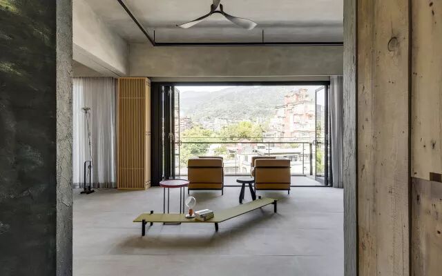 设计师透过材料的选择,如回收旧木、水泥、磨石子、榻榻米等,探讨如何透过材料之于空间的表情,呈现在地文化的传递。具有岁月凿痕的回收旧木料(台湾原生树种老桧木),与特殊水泥质朴亚光的沉静材质表现来做成空间的形塑,除了满足生活需求外,更将居住者对于生活记忆的点滴印记,传递在这个空间里