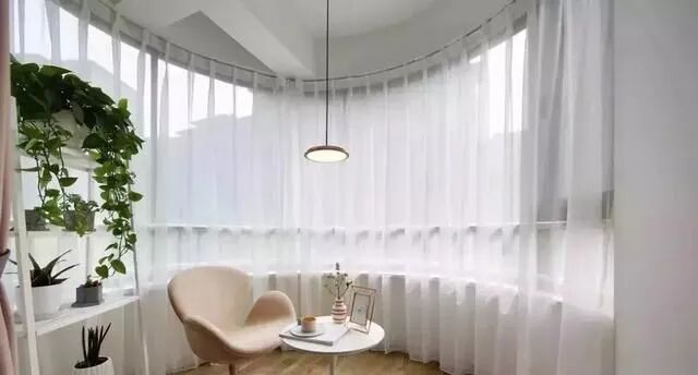 主卧拥有一个椭圆形的小阳台,搭配一张休闲椅和小茶几,轻松打造出温馨的休闲区。