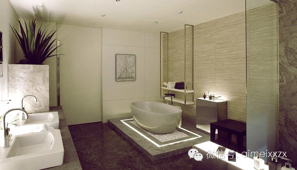 同样是现代简洁的风格的浴室,整洁干练,浴室中放绿植可以改善空气质量。