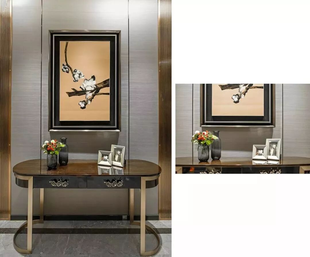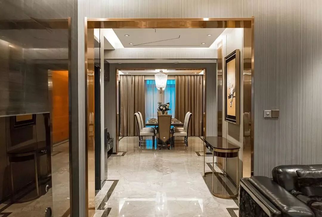 地面配以石材为整体打一个单一色调的底色,然后墙面我们使用阿玛尼的面料来做界面处理,这个面料在灯光的变化下很有质感,很有品味。