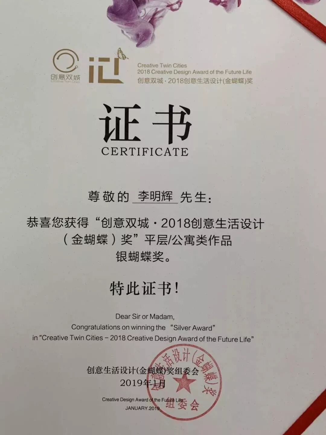 宁夏昌禾装饰,易上别墅设计机构设计总监李明辉,荣获2018创意生活设计【银蝴蝶奖】。本次获奖证书及奖杯由金蝴蝶奖全球官方认证颁发。