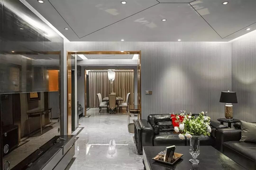 顶面我们没有设计主光源,而以点光源的布置来代替,使得室内光分布均匀,没有光斑。但会有很好的光影效果,同时满足起居生活使用。一块被几何形状分隔的块面吊顶,它的光带打向四周,会有一个漂浮的感觉,不会有大块面所带来的压迫感。