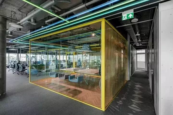 而且每个区域都包含了一个休息区和一间小型私人会议室,然后每个区域都是采用了玻璃隔断分开并配备了吸音声学材料,以创建安静的工作空间,同时其实也是提供一个可以秘密会议的空间。