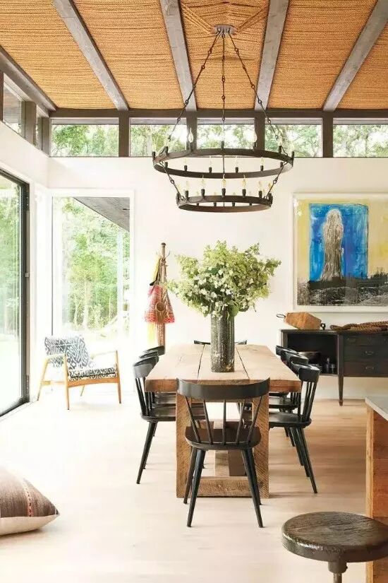 在这间位于汉普顿的当代住宅中,设计师用绳子覆盖天花板,用木梁固定,增加了室内的温暖。餐厅上方的天花板上悬挂着一盏双层吊灯,引人注目。明亮、温暖的木地板和吊顶的组合,使充满光线的空间感觉层次分明,舒适。