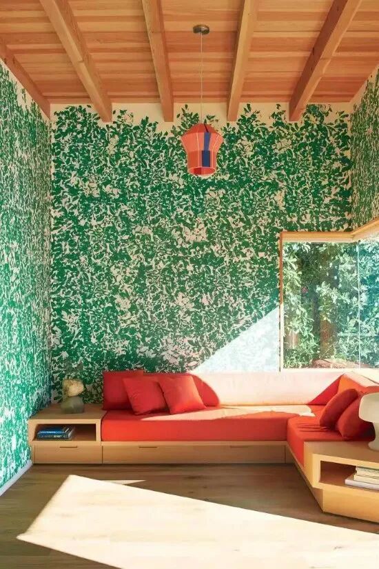 油漆不是装饰天花板的唯一方法。在这个充满光线的日光室中,墙壁上覆盖着绿叶图案,而亮橙色的部分和吊灯给空间带来了温暖。温暖的木质色调覆盖了地板,内置沙发和天花板营造出温馨的氛围。简单地将这个天花板漆成白色很容易,但是木板和横梁真的把整个房间拉到了一起。