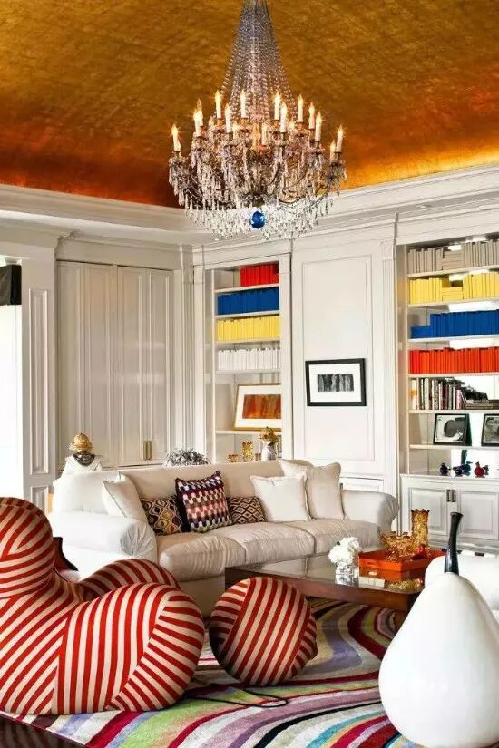 在这个色彩斑斓的房间里,穹顶天花板上点缀着一盏水晶吊灯,上面覆盖着金箔。皇冠造型内衬隐藏轨道灯,在镀金的天花板上投射出奢华的光芒。这种处理方法并不适用于所有人,但它确实引人注目,并使人深刻认识到,只要注意第五面墙,就可以彻底改变一个房间。
