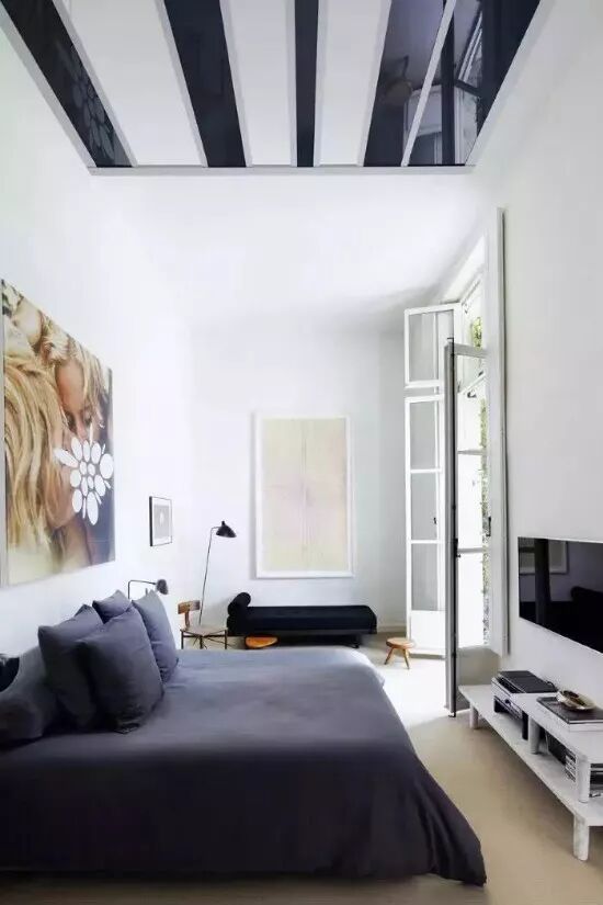 引人注目的最佳方法之一是在天花板上涂上条纹。在这间带超高天花板的狭窄卧室中,床上方的空白部分被亮蓝色和白色的条纹凸显出来。