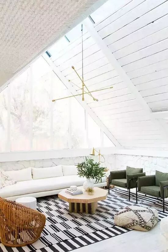 有时,最简单的天花板就是最好的。在这个a形框架的别墅里,设计师将整个拼出的空间涂成了白色,并悬挂了一个极小但引人注目的黄铜吊灯,以吸引人们向上的注意力,并提供一种几何效果。高高的天花板保持白色有助于营造宽敞空间的错觉。