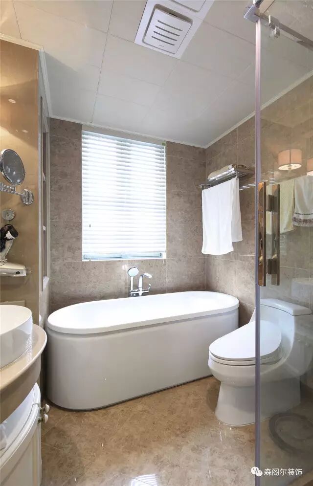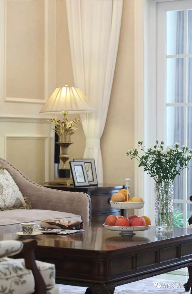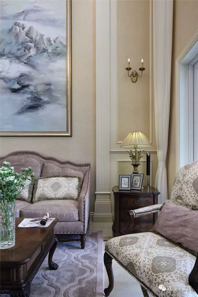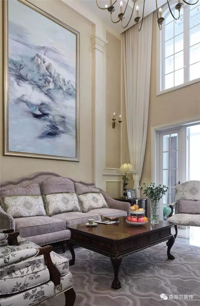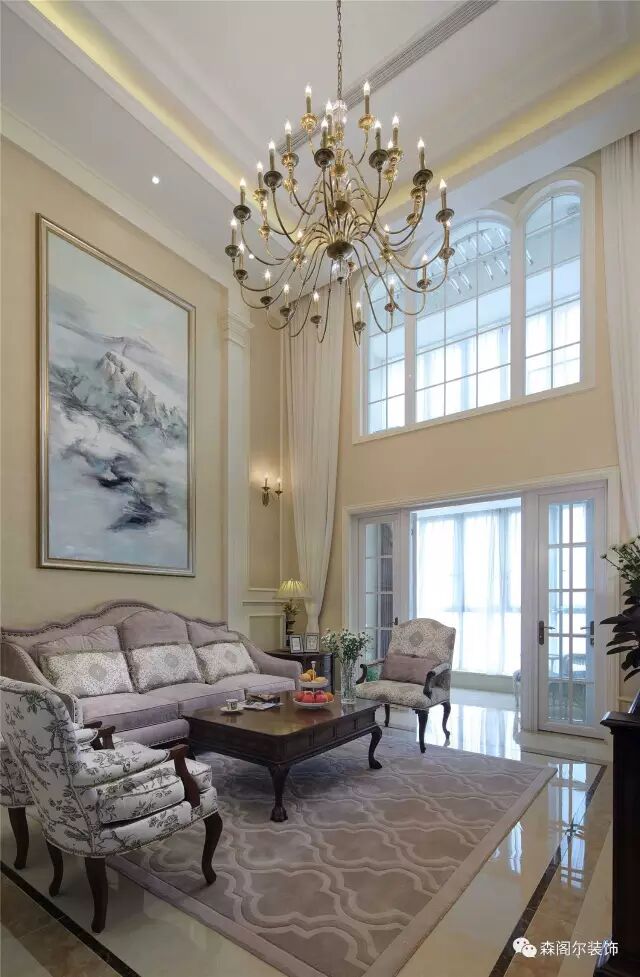 米黄与白色为主色调,贯穿了整套设计。客厅的挑高空间,拉长了线条比例。黄铜订制吊顶灯,给素雅的客厅空间增添了一丝贵气。