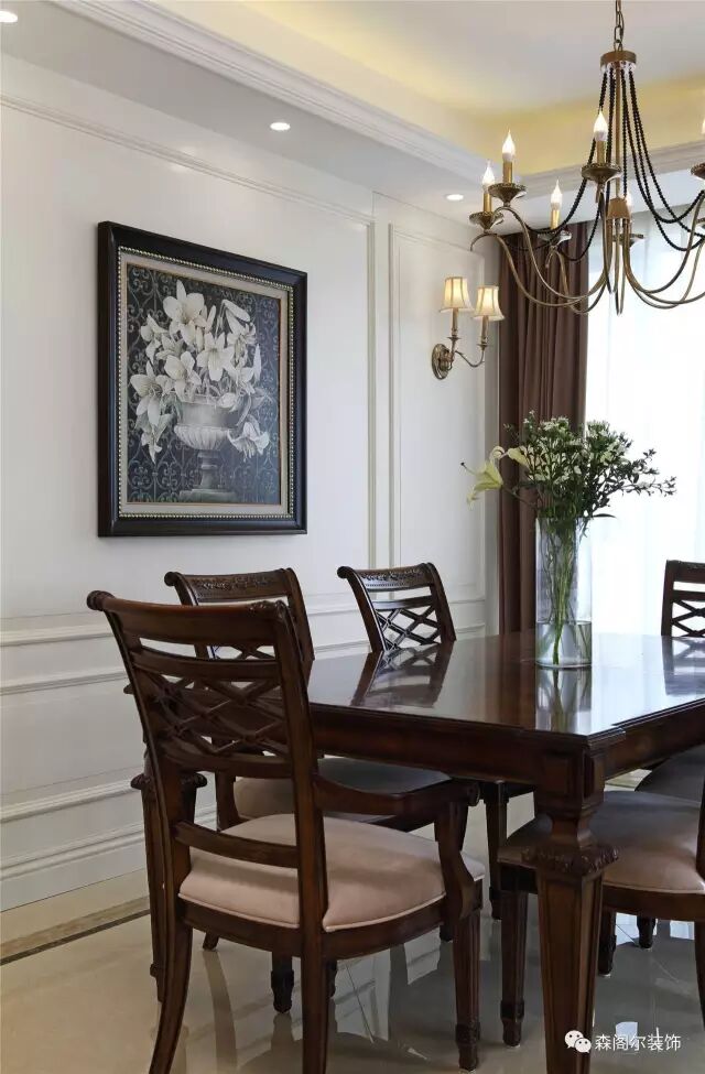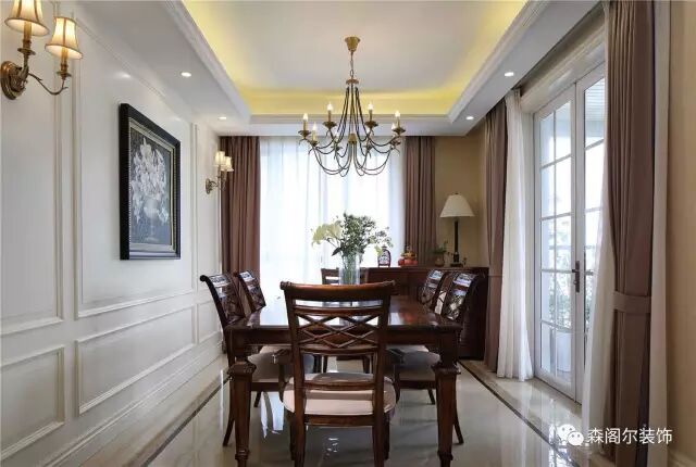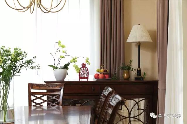阳光透过精致的玻璃门洒向餐厅,将精致的餐桌、餐边柜、鲜花照的熠熠生辉。