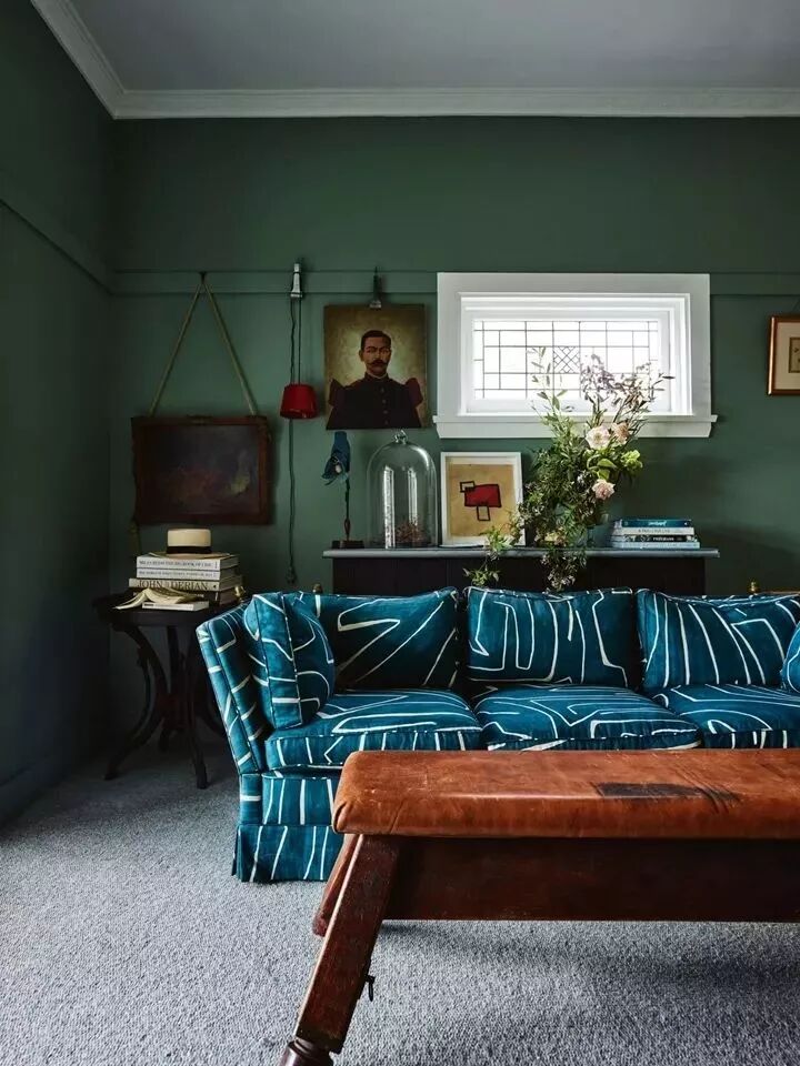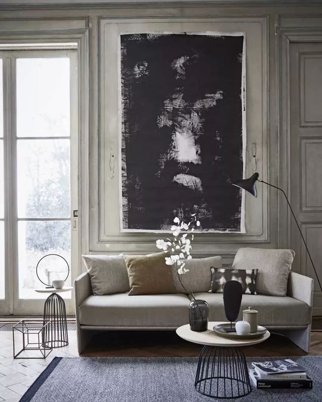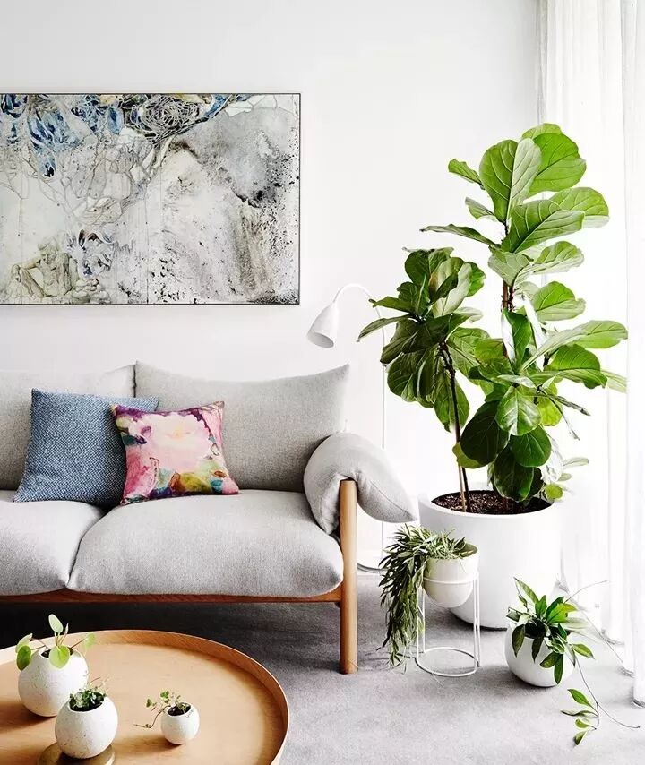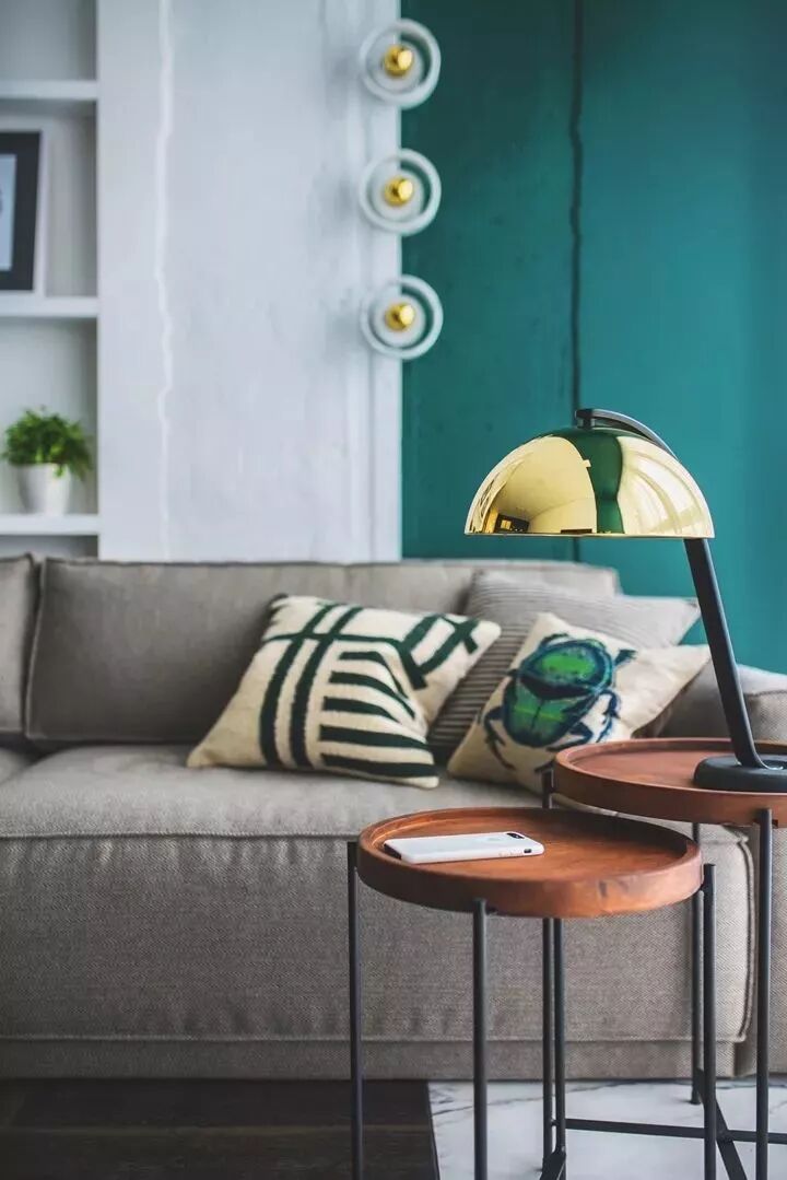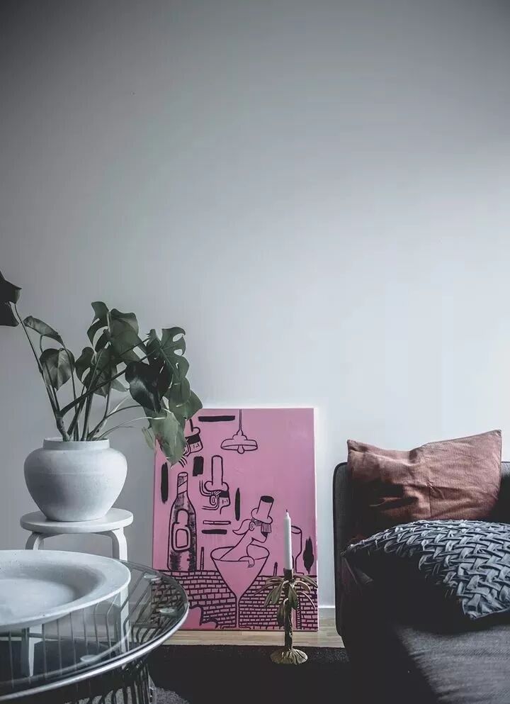 沙发背景墙也可以不局限在“挂置”这种方式上,倚在墙角或放在沙发背部上,错落的美感让空间更加随性。