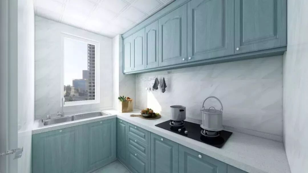△ 岩青色橱柜给人一种优雅的感觉,搭配浅灰色墙地砖,整个空间显得舒适大气,带着淡淡的梦幻感。