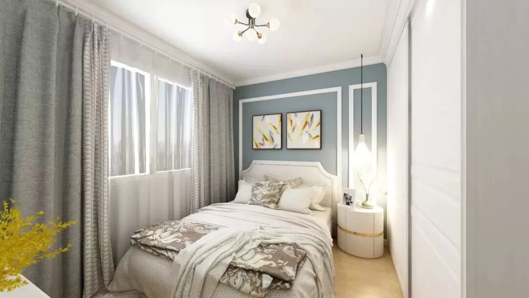 △ 主卧是夫妻二人的休息区域,清素淡雅的蓝色背景有助于放松心情,床头柜的造型可人的柔光吊灯能让人更快地卸下疲倦。