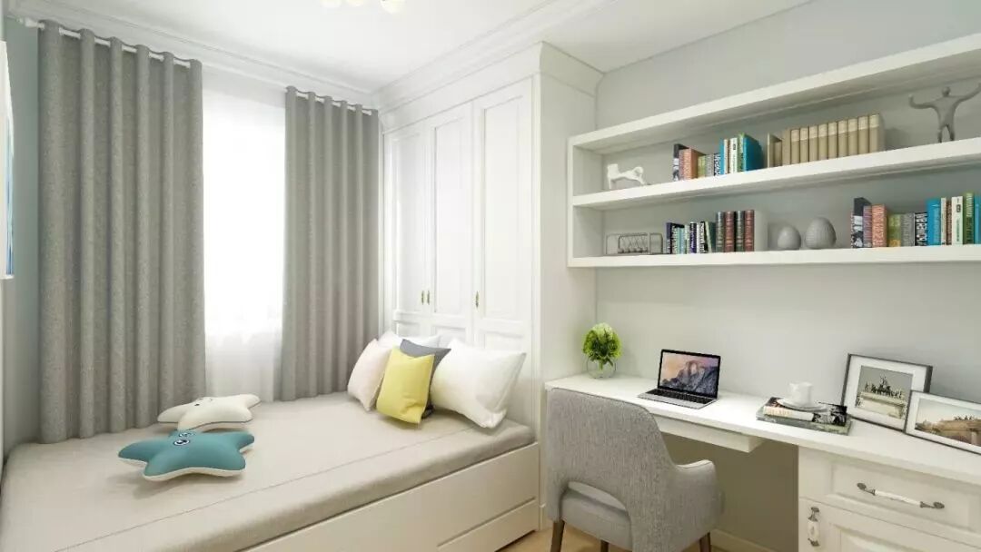 △ 次卧未来将会改造成儿童房,在此之前会当做书房来使用。榻榻米设计可以增加储物空间,书桌和开放式书柜组合,为夫妻二人提供了办公条件。